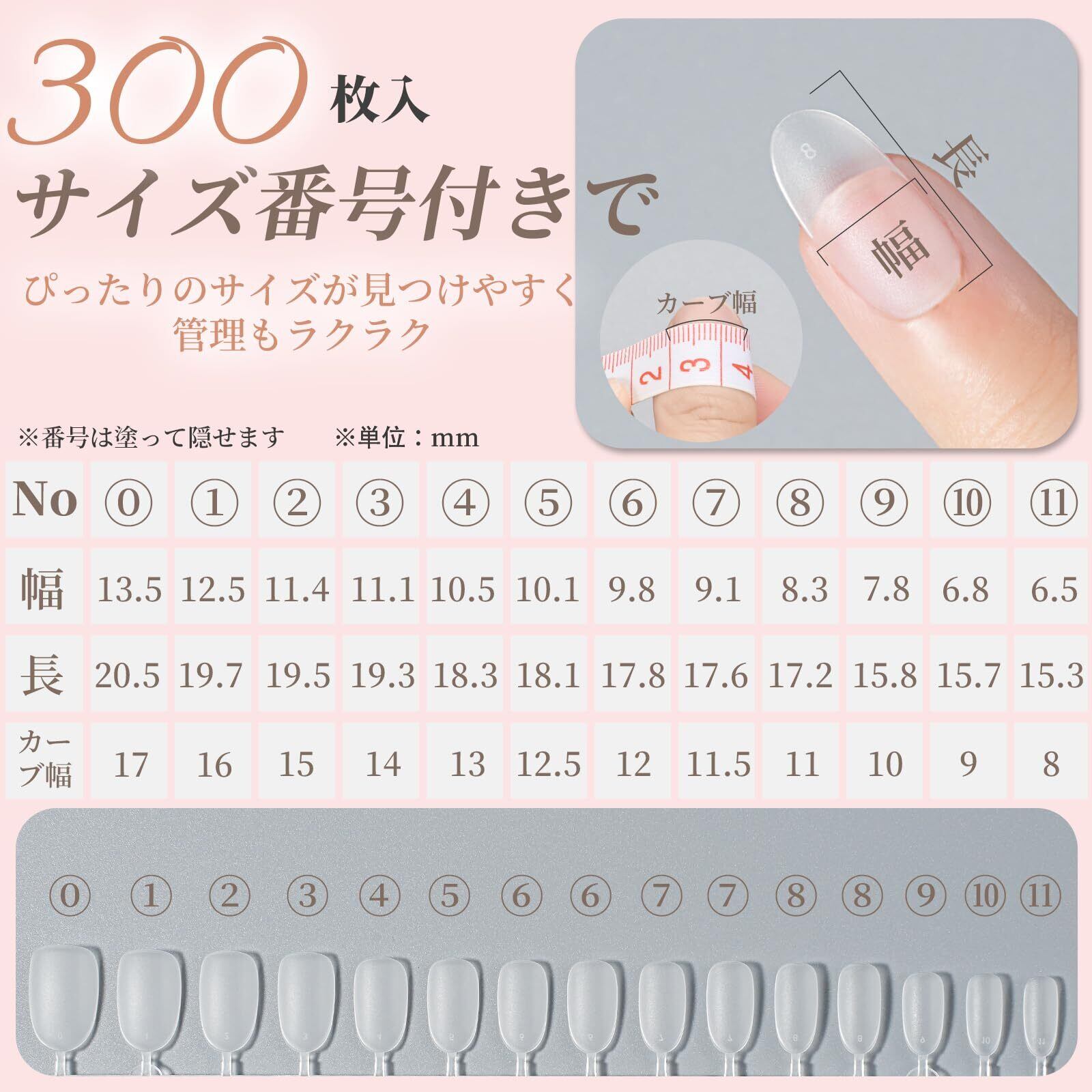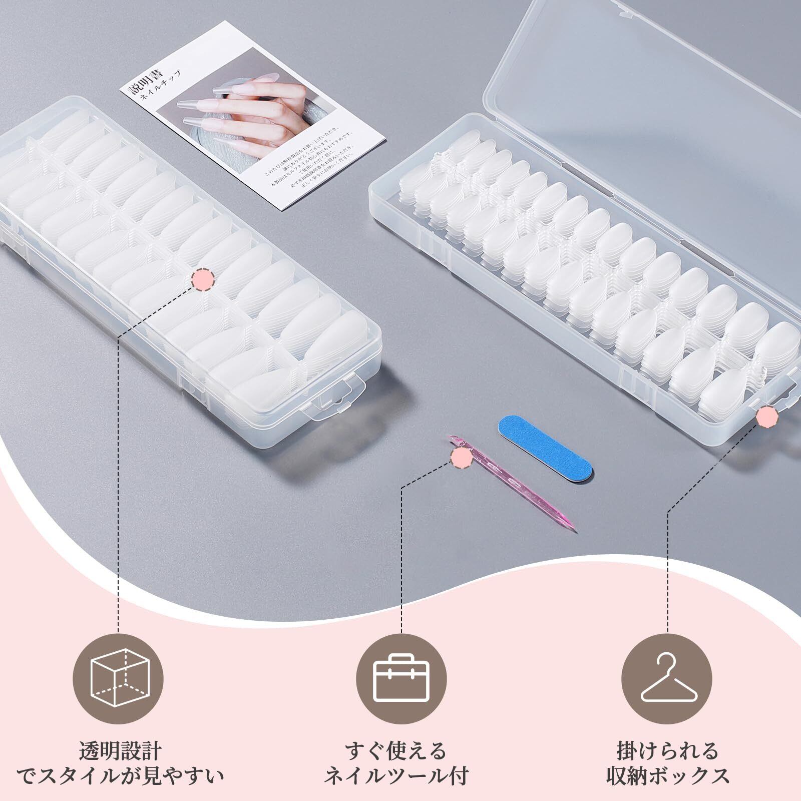【使いやすさ抜群!】BEIHOOのクリアチップネイルは全11種のデザインをご用意。バレリーナ(S/M/L)、ポイント(S/M/L)、ラウンド(S)、スクエアオフ(S)、オーバル(S/M/L)など、多彩なスタイルから、お気に入りの透明 ネイルチップ がきっと見つかります。サイズ番号付きで、自分に合ったサイズがすぐにわかり、管理もラクラク。収納ケース(ボックスのツメのくぼみ部分を押し、指の腹で軽く持ち上げると、簡単に開けられます)・ネイルツール・日本語説明書付きで、初心者でも自信を持って始められます。