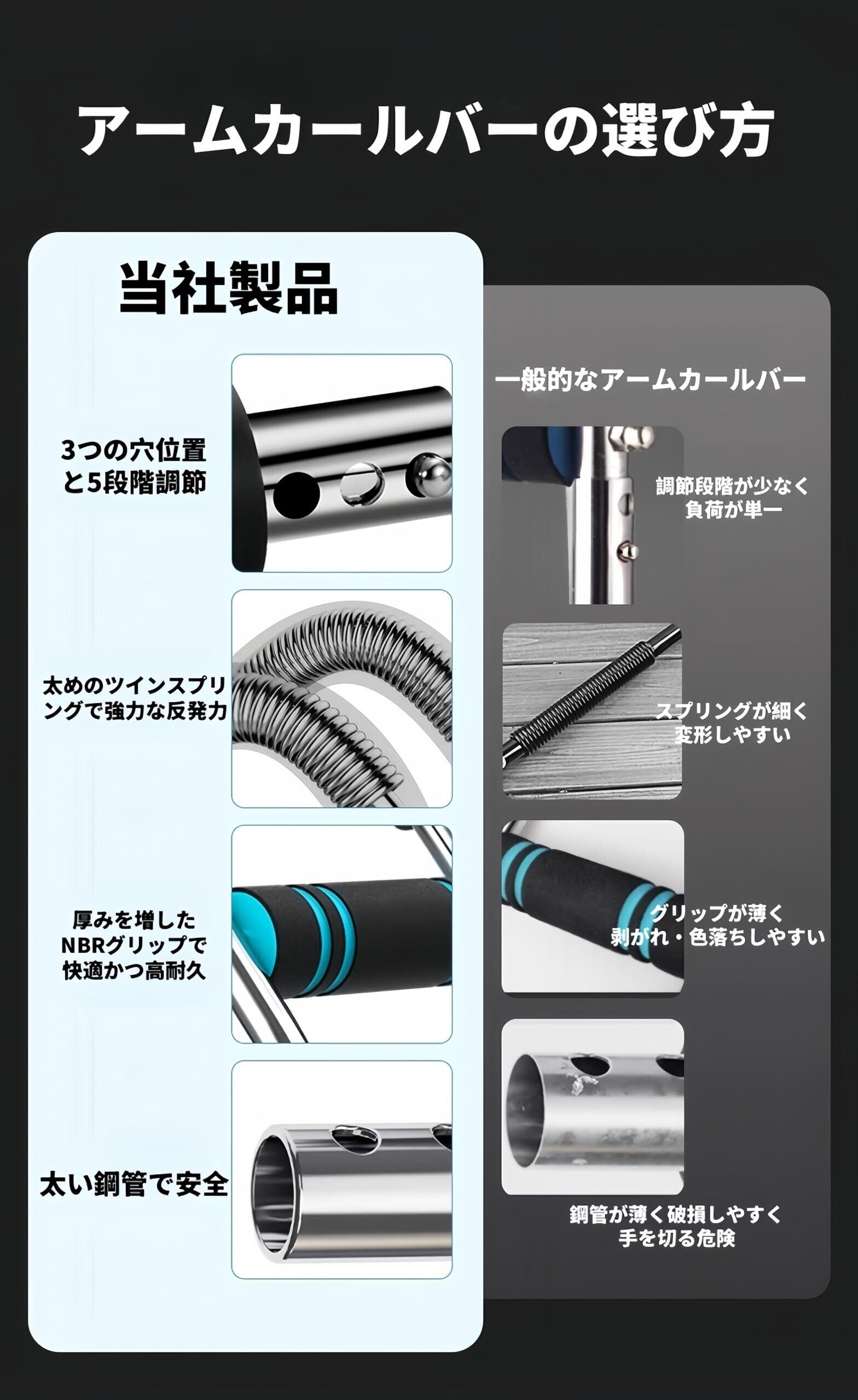 高耐久素材採用 —— 航空機グレードの鋼製バネに滑り止めフォームグリップを組み合わせ,激しいトレーニングでも安全性と耐久性を確保。