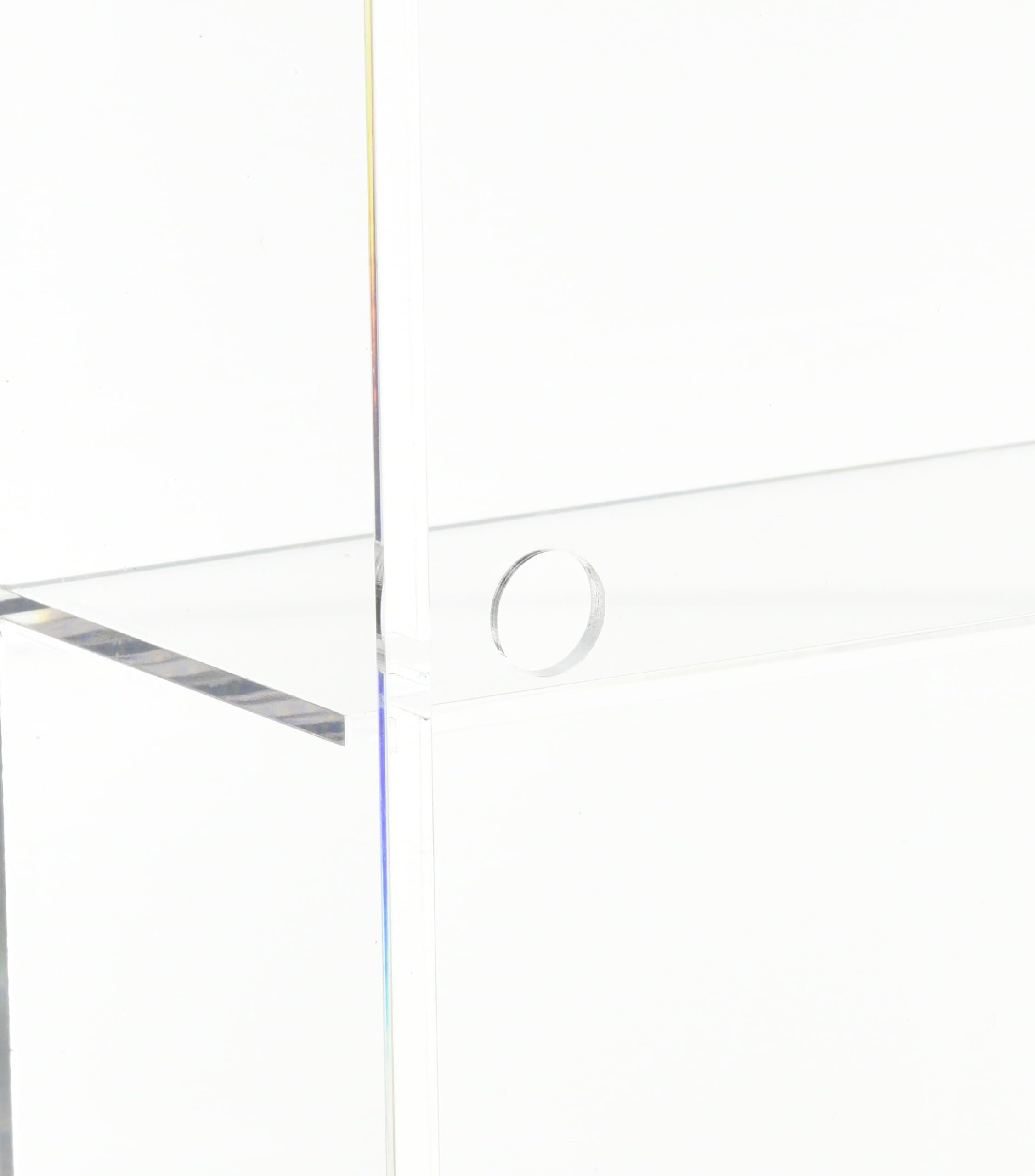 透明なアクリル素材を生かした引き扉タイプの収納です。大事なコレクションを飾りながら収納できます。商品の上下の正しい位置は引き扉の穴が中仕切りよりも上になります。ご使用の際は、本体の引扉用溝の深い方を上側に置いてください。逆さに置くと引扉が外れますので、ご注意ください。