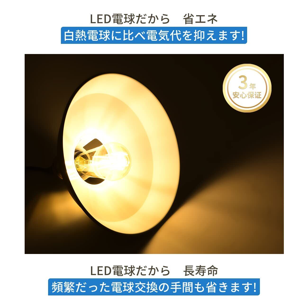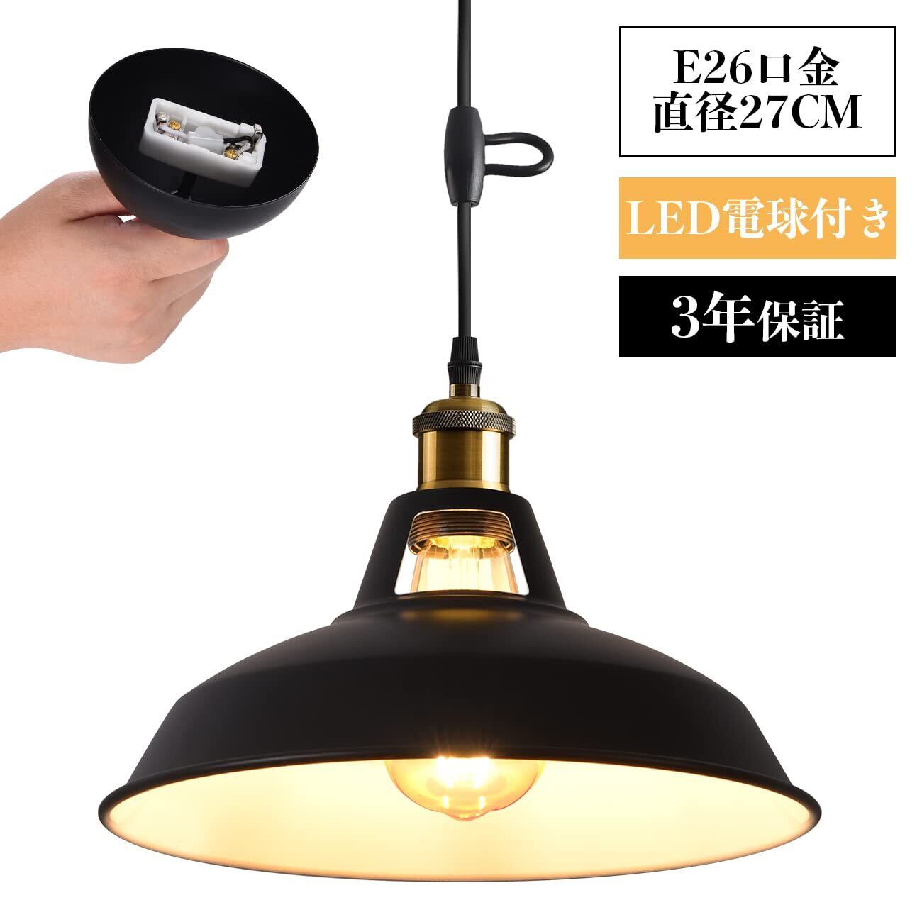【商品情報】◉器具仕様:E26口金、コード長さは60cm調節可能、重量は約600g 、シェードサイズは直径27*高さ15cm ◉LED電球仕様:E26口金 、明るさは720LM、消費電力は6W省エネ(60W形相当)、色温度は2500K電球色、サイズは約64×134mm、調光対応不可 ◉パッケージ:1灯セット