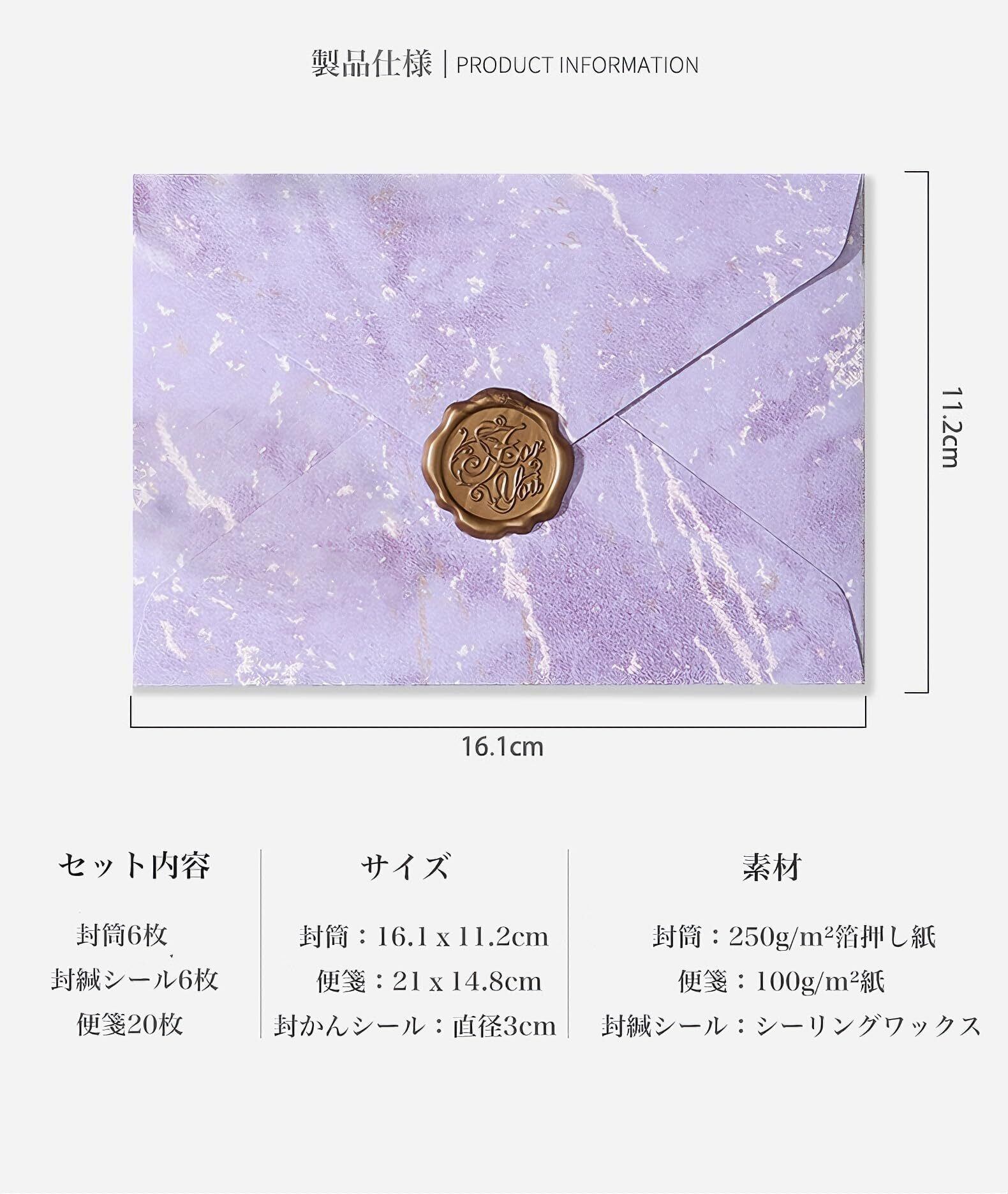 レターセット 手紙セット マーブル柄 封筒6枚 封緘シール6枚 便箋20枚 ラブレター メッセージカード ワックスシール付き 結婚式 誕生日 お祝い (パープル)
