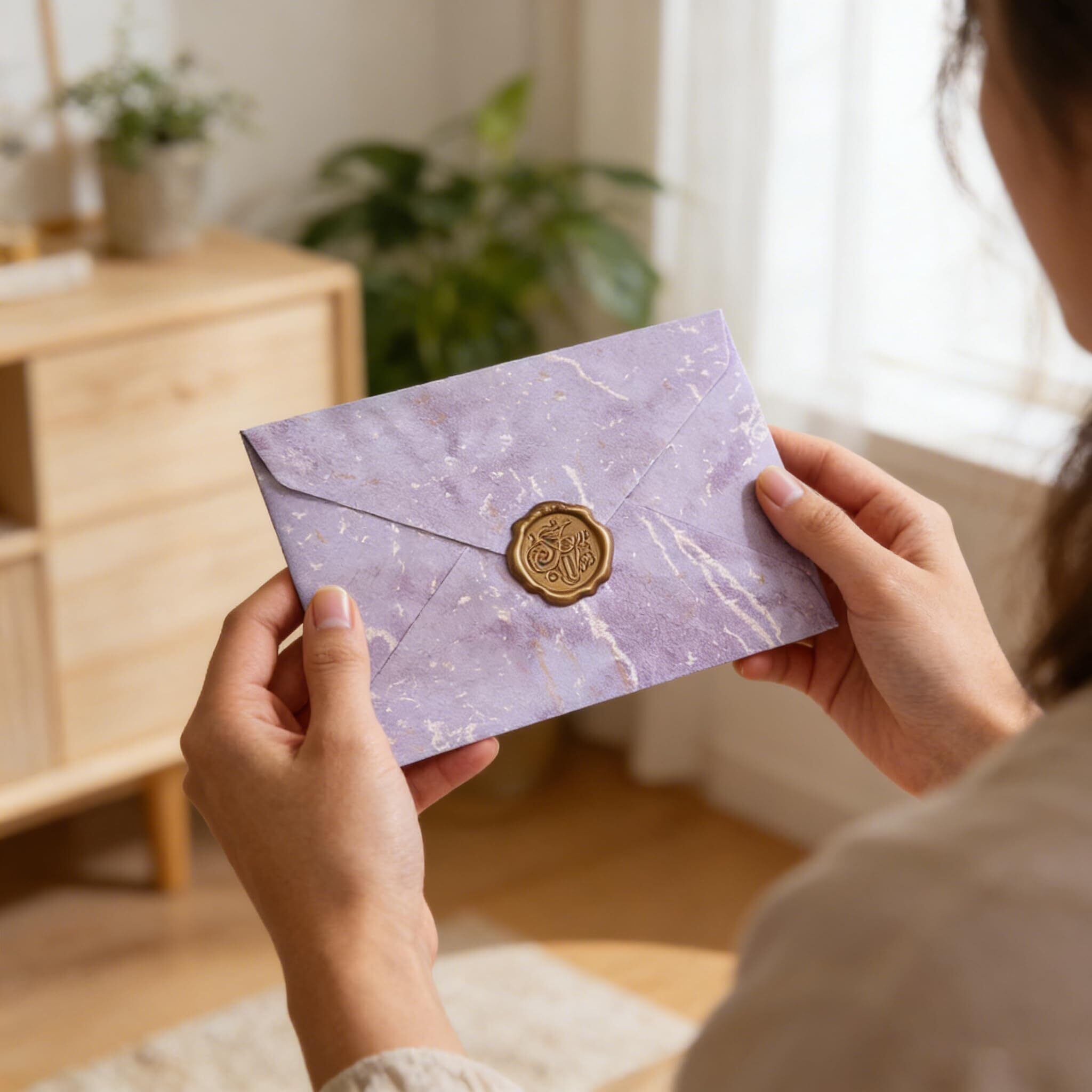 高品質な素材:封筒は250g/m²の箔押し紙、便箋は100g/m²紙、封緘シールはシーリングワックス製で、上質な書き心地と高級感を実現