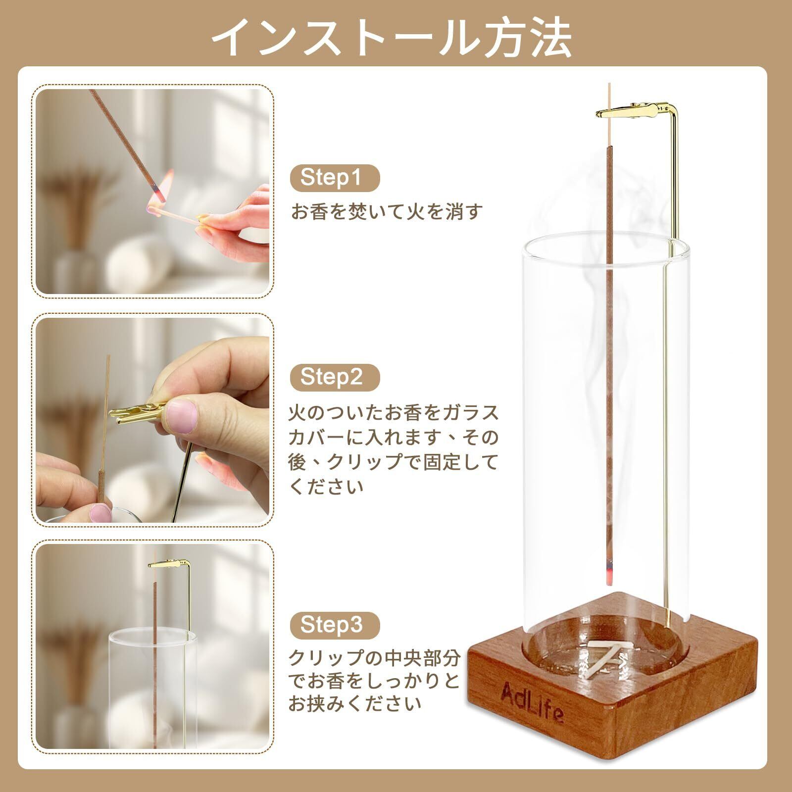 ✓【御洒落なお香立て】透明なガラスお香皿 + 真鍮クリップ + 木製けやき台座の組み合わせが、和室にも洋室にもマッチ。リビング、寝室、玄関など、どこにでも合わせやすいデザインに仕上げています。上質な素材感が空間を引き立て、インテリアとしても魅力的です。自宅、旅館、仏堂、茶室、居酒屋、図書館、瞑想室、御手洗い、ティーハウス、オフィス、リビングルーム、ヨガなど、空気を浄化したい、やさしい香りを楽しみたい空間に最適です。