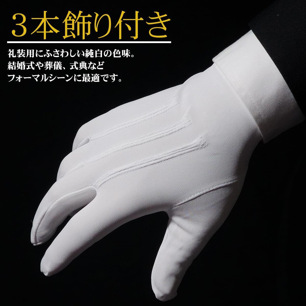【指先マチ付きの立体縫製】指が動かしやすい設計で、接客・運転・式典などの動作もスムーズ。快適なフィット感を実現しました。【幅広い用途とサイズ展開】S〜LLの4サイズ展開。結婚式・葬儀・式典・接客業・選挙事務所・応援団など、あらゆる礼装シーンに対応します。