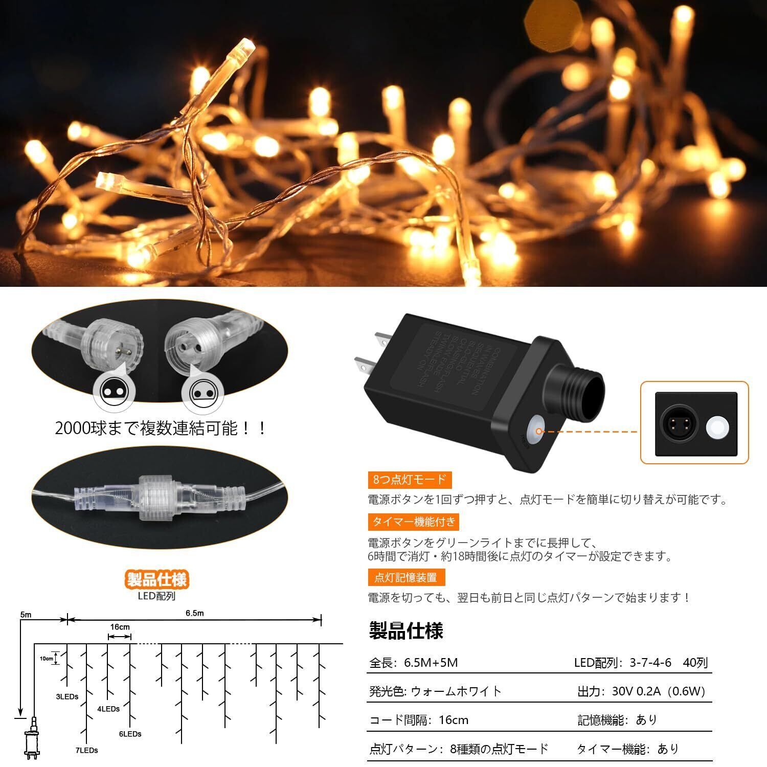 ◆【アイシクルライト】つららライトは横に伸びたコードから不規則な長さでLEDライトが垂れ下がっているのが特徴です。その特徴を活かして、建物の軒下によく使用されております。コードを伸ばすと、LED電球がつらら状に垂れ下がり真冬の氷柱が輝いているような演出が可能になります。仕様: LED配列: 3-7-4-6, 40列 ; 電球数:200球;コード間隔:16cm;発光色: ウォームホワイト