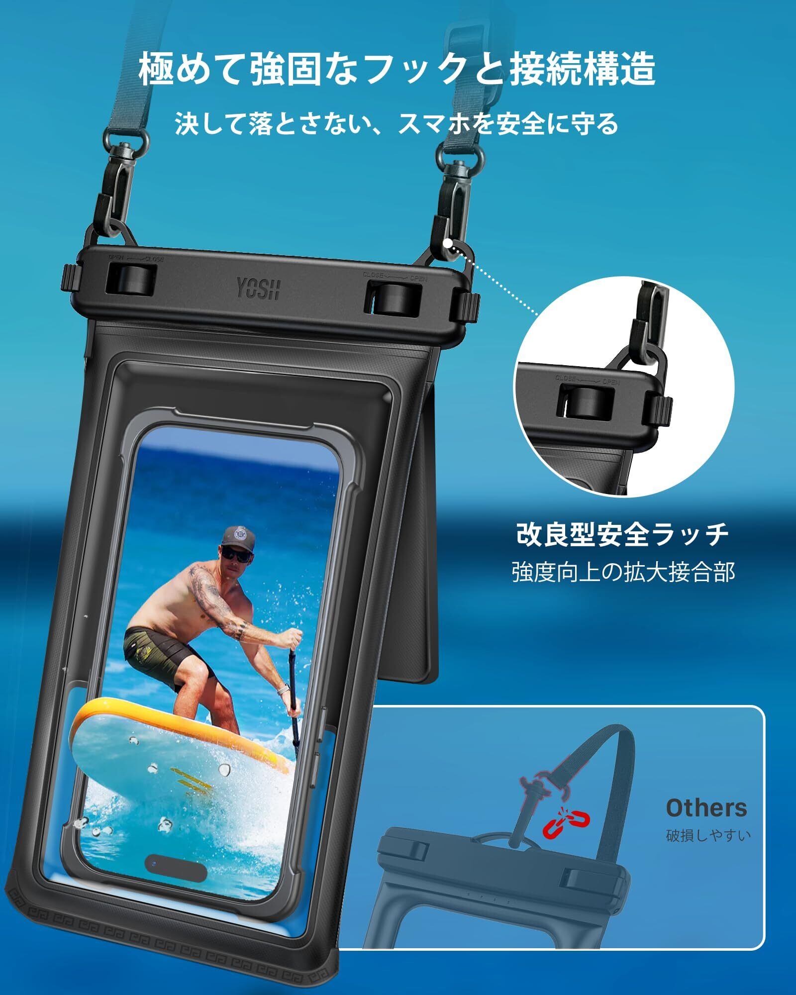 【IPX8防水】YOSHスマホ 防水ケース お、4層構造の枠で防水効果を向上させました。防水国際保護等級IPX8認定を獲得し、水深約30mの環境でも30分間の防水が可能です。この完全防水スマホケースは、お風呂、スキー、温泉で音楽や動画を楽しむ、海、プール、ビーチ、水泳、ダイビング、サーフィン、料理をしながらスマホを使う、野外コンサート、雨の日など、あらゆるアウトドアやレジャーに最適です。