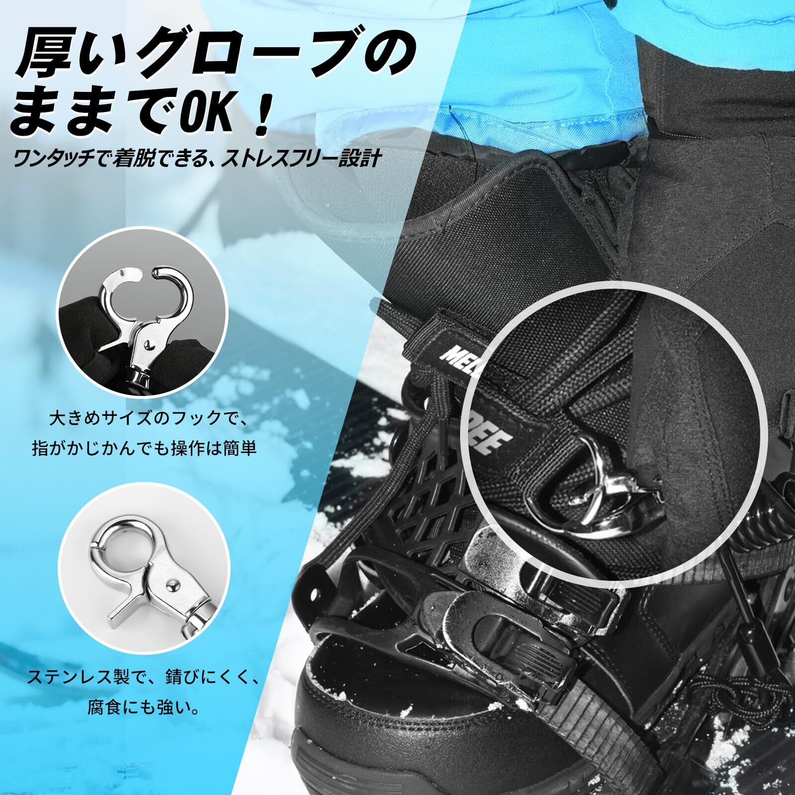 【BOA靴にもやさしくフィット】幅広ベルクロが面で支え、ブーツを傷めにくい。穴あけ不要でレンタル靴や複数ブーツでも使いやすい。