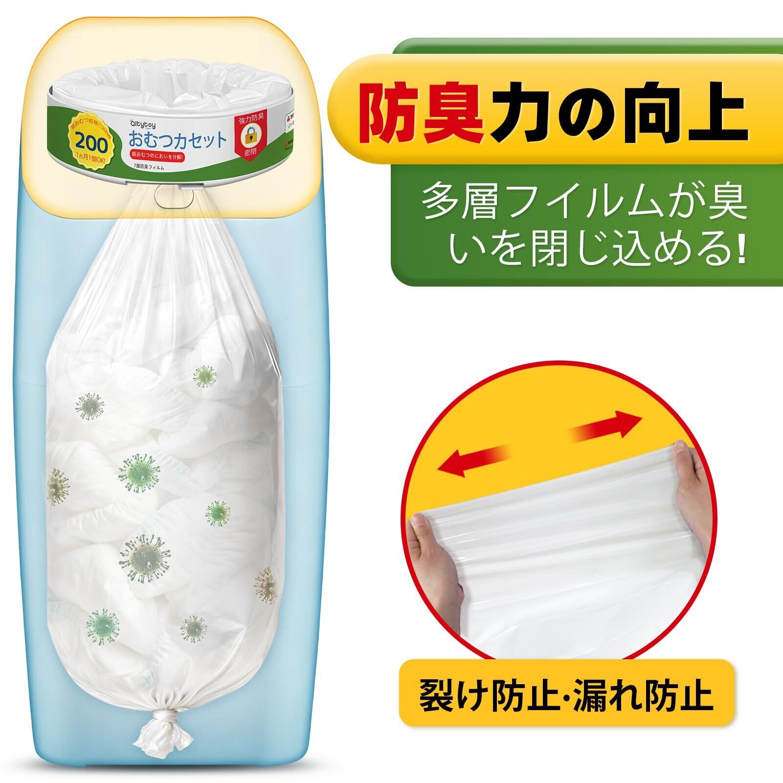 【強力防臭】オムツ消臭袋最新技術と高機能素材を採用!気になるニオイ漏れをしっかり防止。ご家庭の中をいつも清潔に保ち、ママの強い味方となる商品です。きっとご満足いただけます。