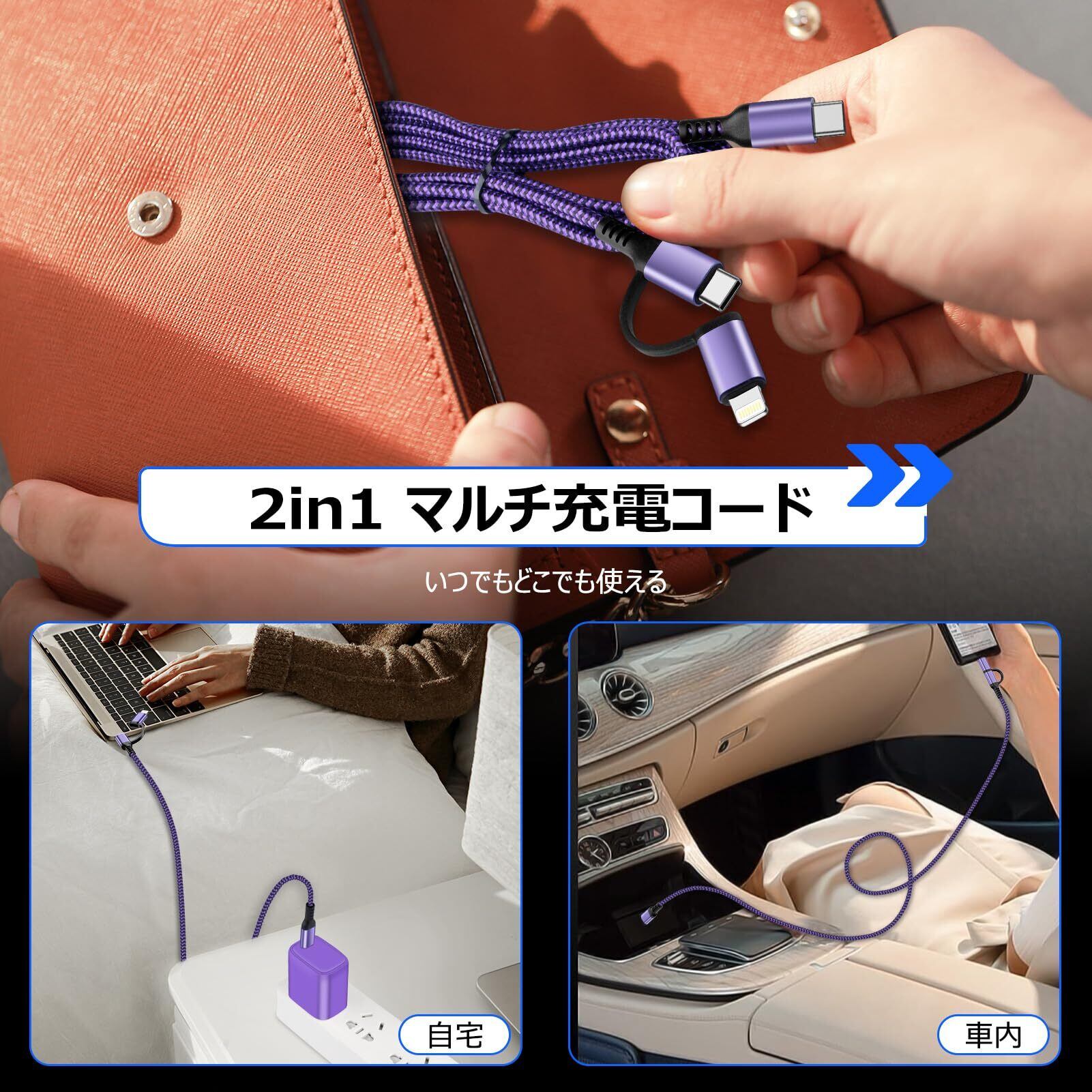 2in1 充電ケーブル USBC to Lightning/タイプC 1.8M PD対応 30W急速充電 高速データ転送 Haoano Type C ケーブル アイフォン マルチ充電コード iPhone 15/15 Pro/14/13/12/SE/iPad Air/iPad Mini/Galaxy S24 Ultra/S23 パープル