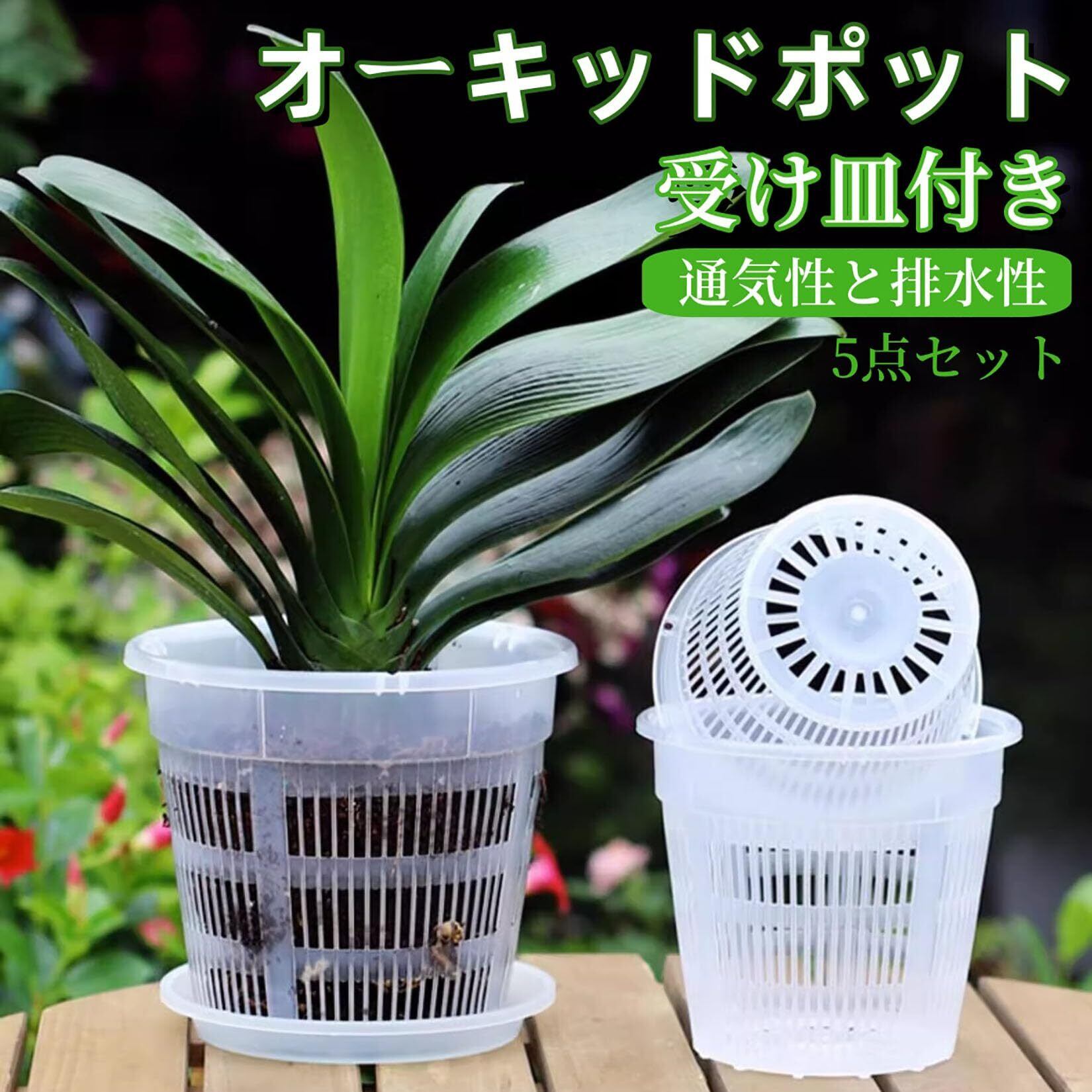 Orirya プランター 植木鉢 プラスチック スリット鉢 透明 円形 オーキッドポット 観葉植物 多肉植物 鉢植え 穴付き 受け皿付き 胡蝶蘭鉢 育苗ポット 園芸用品 5点セット 14cm