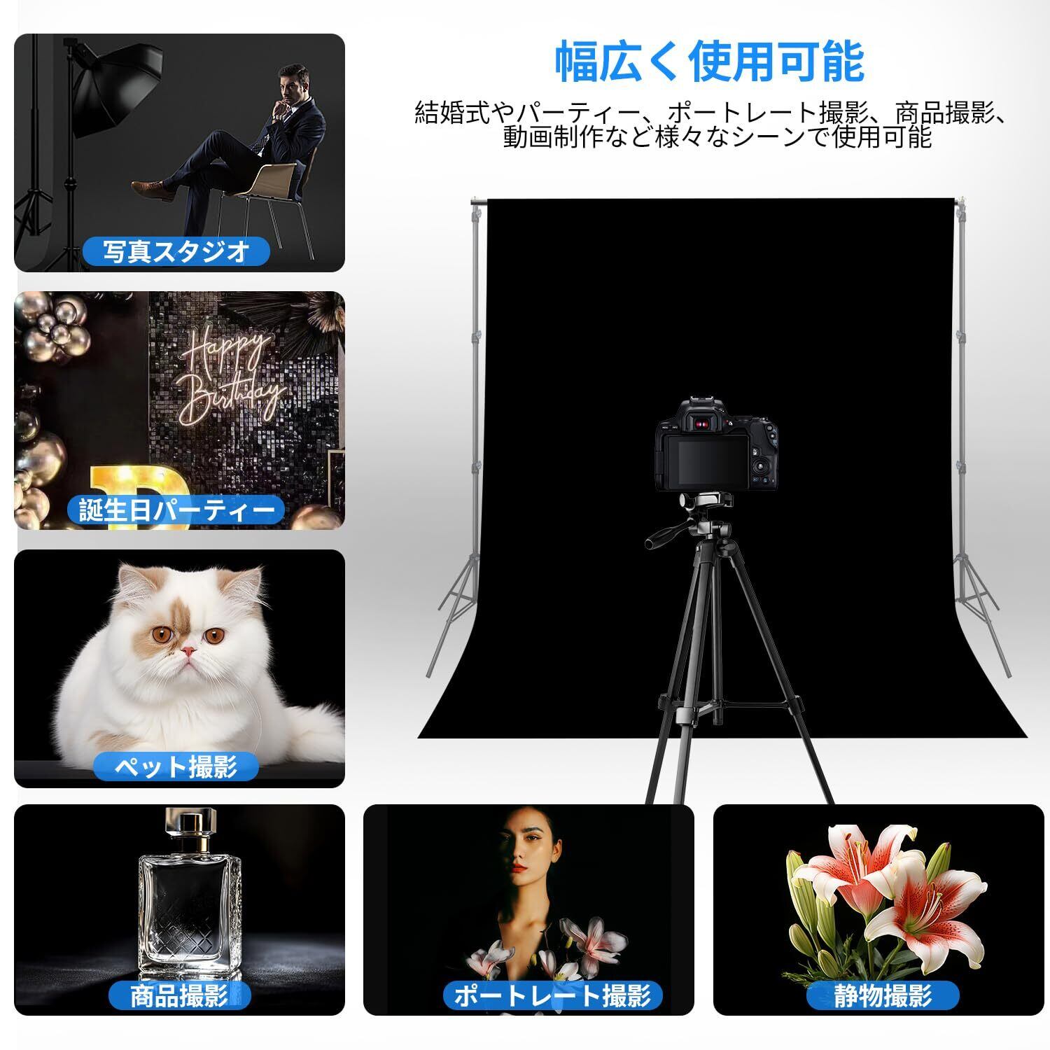✨【プロフェッショナルな撮影をサポート!Hemmotop背景布!】「Hemmotop 背景布」は、写真撮影に特化した高品質な黒色の暗幕です。150 x 200cmのサイズで全身撮影も対応可能。無地デザインは、シーンを選ばず多様な用途に活用できます!