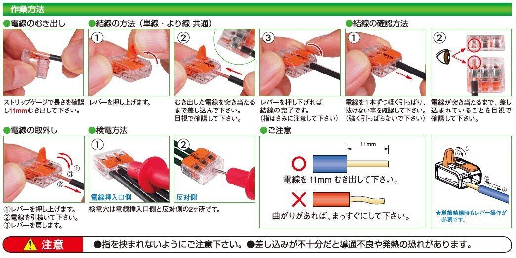 ●8個入●ブリスターパック●電線数:3本●定格(一般用途):32A-450V●見える・簡単・小型・ゆるまない・単線、より線OK●透明化:ハウジングを透明化し確認しやすい。●スリム化:WFシリーズから40%の小型化。●ソフト化:より操作がしやすいレバー形状。