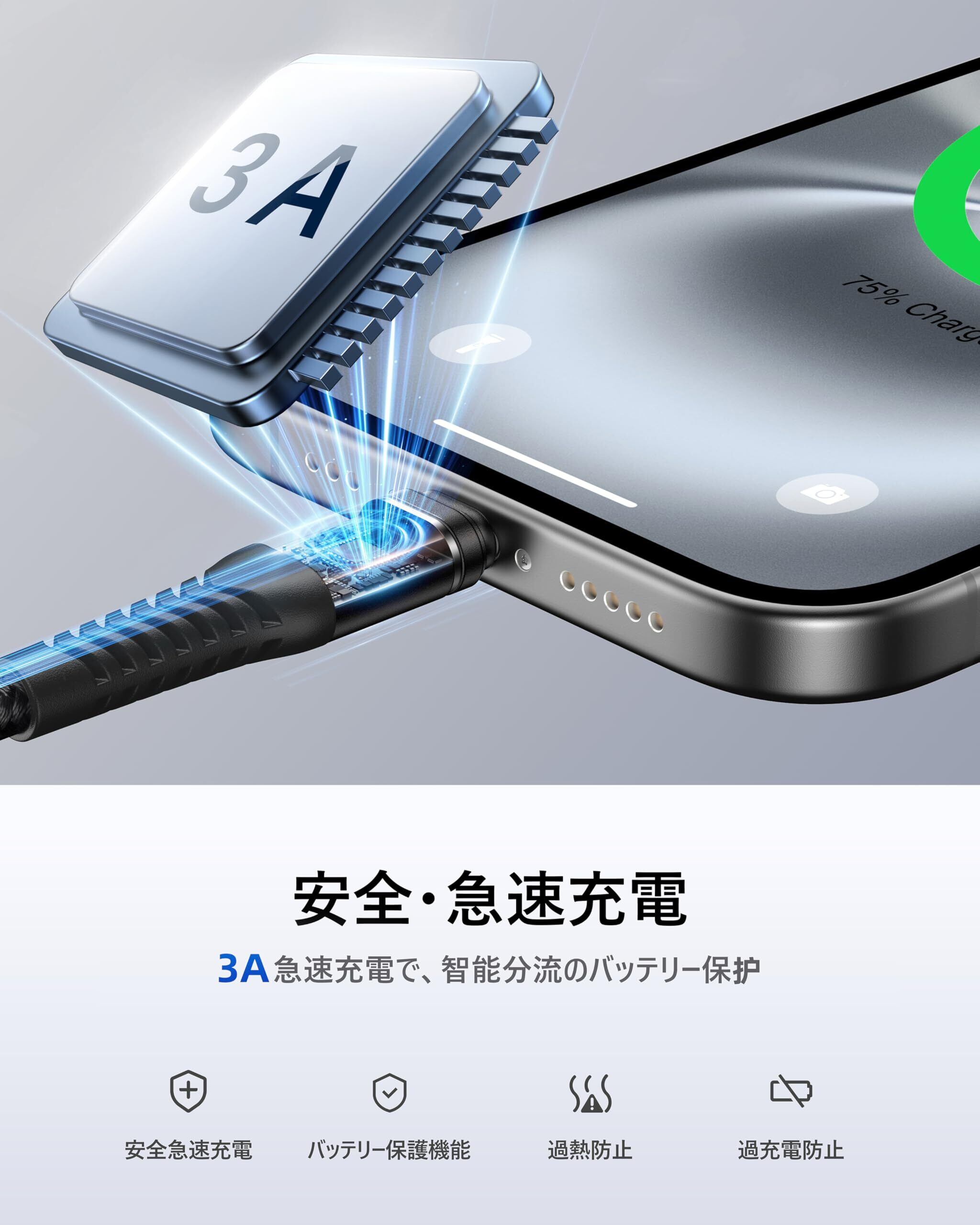 【智能充電技術】タイプC 充電ケーブルは智能充電チップを内蔵し、接続デバイスを自動認識して最適な電流を供給。過充電保護、過電流保護、短絡保護など、多重安全機能により、安全な充電を確保し、優れた保護機能を備えています。
