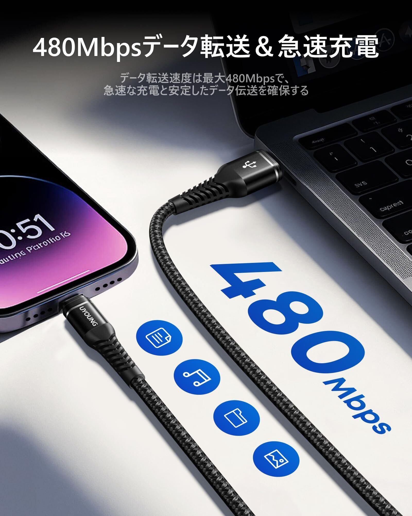 【480Mbps高速データ転送対応】USB 2.0規格に対応し、最大480Mbpsの高速データ転送を実現。大量の写真や動画、ファイルの転送を素早く完了でき、充電とデータ転送が一本のUSB A to USBC ケーブルで可能。効率的なデータ管理をサポートします。