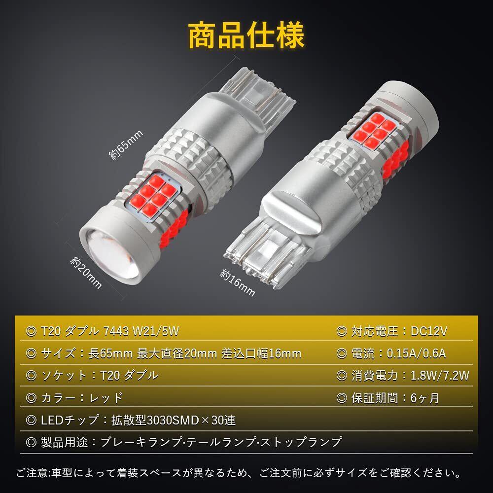 T20 LED ダブル ブレーキランプ 赤 レッド 爆光 キャンセラー内蔵 ウェッジ 7443 W21/5W LEDバルブ 電球 12V 車 テールランプ ストップランプ ブレーキ 車検 無極性 拡散型3030SMD 30連 2個入り