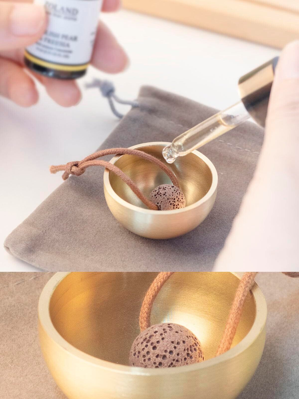 【おりんのデザイン】このおりんはディフューザーストーン付きです。石にエッセンシャルオイルを垂らして香りを拡散させることもできます。もちろん、そのまま使うこともできます。アロマテラピーがお好きな方は、エッセンシャルオイルを使ったアロマテラピー仏壇をDIYしてみませんか。