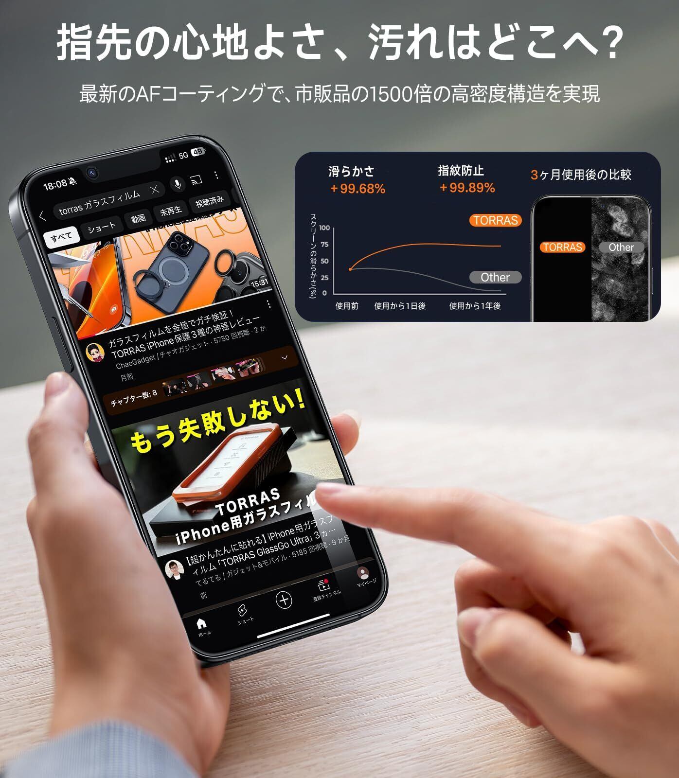 【HD級高透過率・疲れ目のない快適視覚】蛾の眼を模倣した新技術を活用し、透過率はほぼ100%。元の画面の臨場感をそのままに、細部までクリアに映し出す。さらに、TORRASの進化したアイケア技術で、有害なブルーライトを効果的にカット。長時間のスマホ使用でも、目の疲れやストレスを大幅に軽減する。色付け品とは異なり、画面の色彩や明るさに妥協せず、自然で快適な視覚体験を実現。