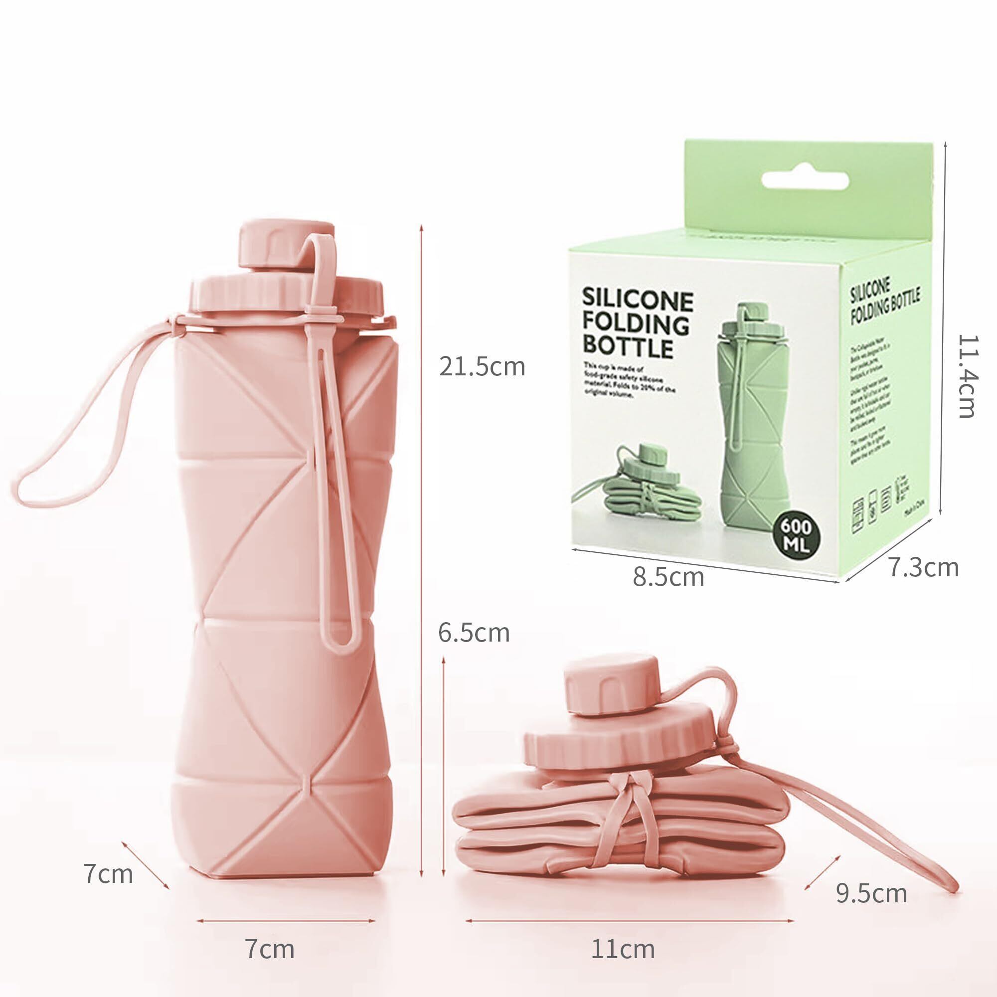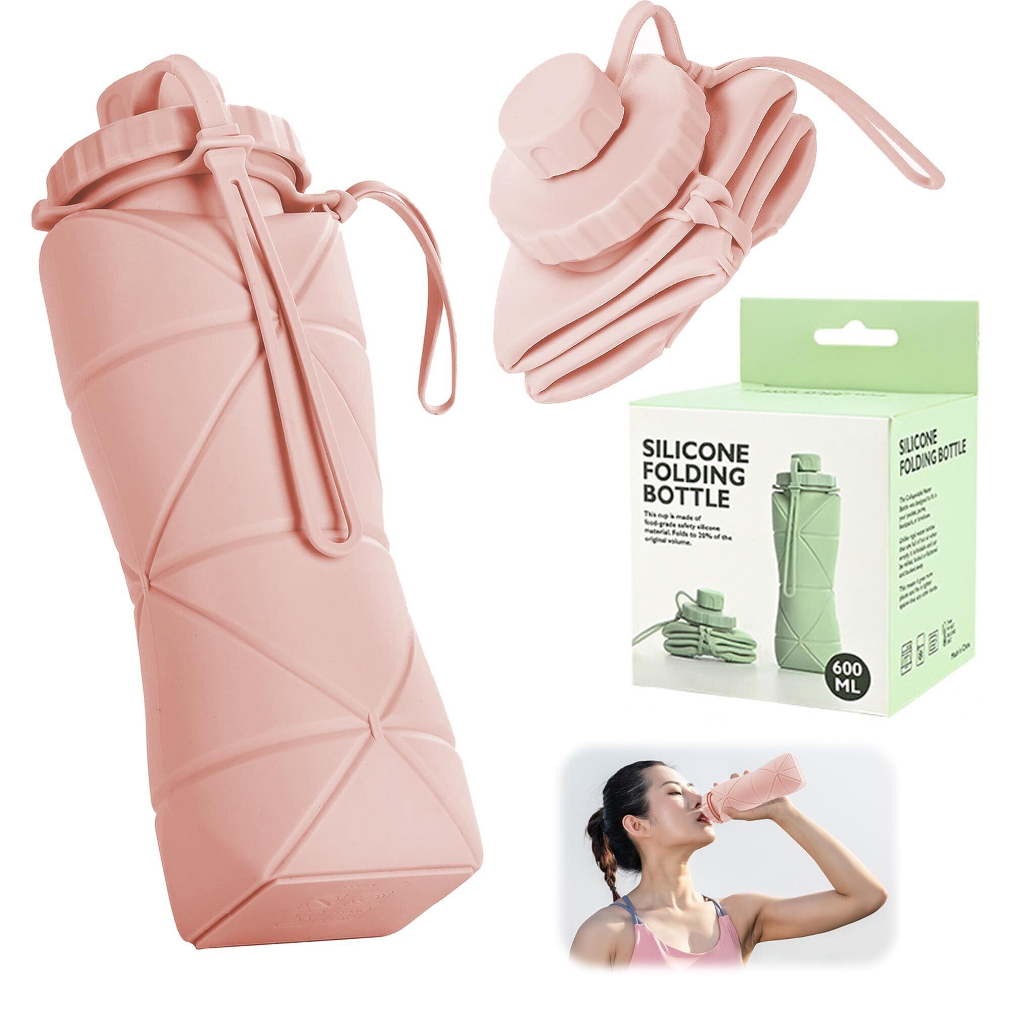 600ML 折りたたみカップ シリコンウォーターボトル 折りたたみマグカップ 蓋付き アウトドア/ピクニック/旅行/日常使用 携帯便利 耐熱 多機能 スタイリッシュ(ピンク、600ml)