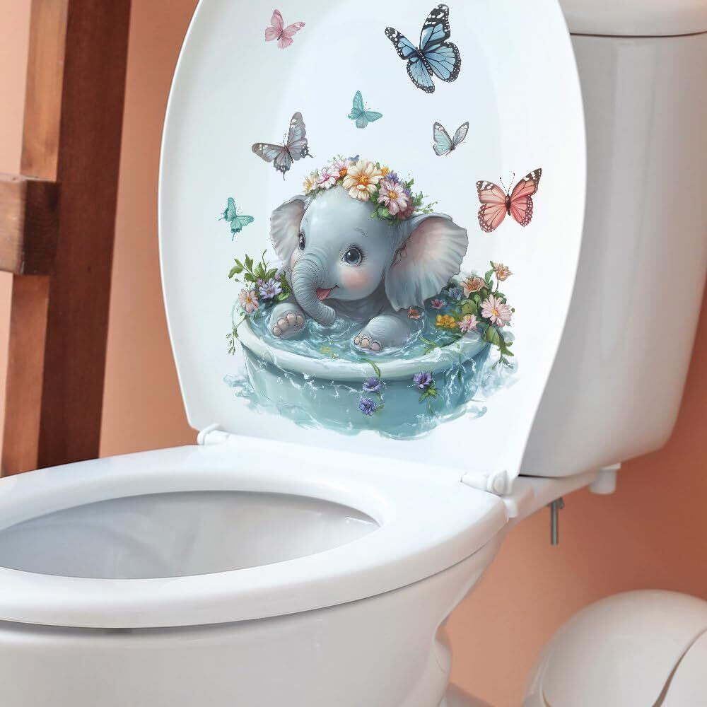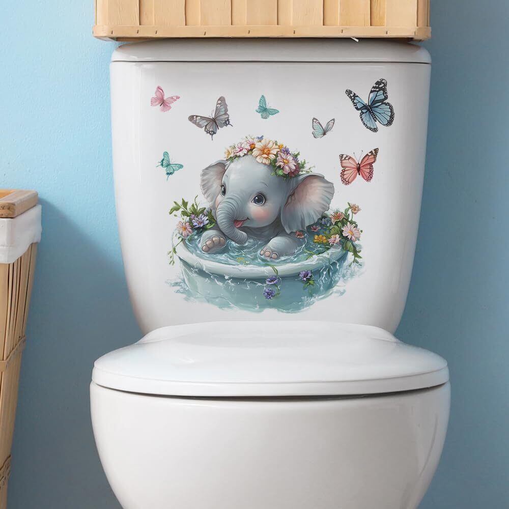【在庫セール】便器 シール ウォールステッカー 動物 可愛い トイレ用デコレーションステッカー, 象と蝶のデザイン, かわいい花柄,トイレ ステッカー おしゃれ,トイレタンク 飾り,かわいい動物 便器 ステッカー ,toilet sticker 便器に貼るシール 29×29cm, 防水デコレーションシール