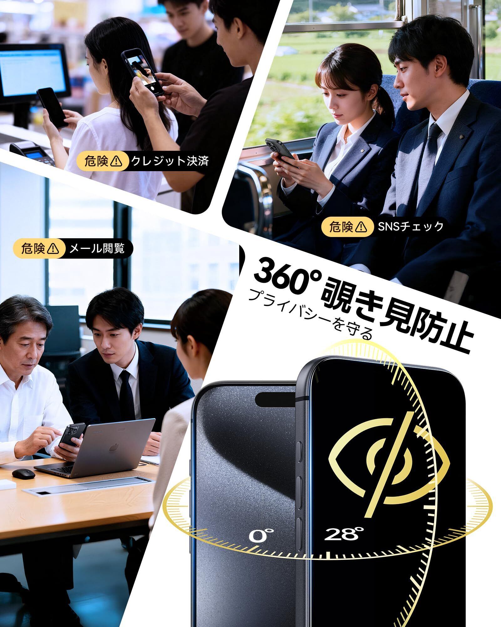 【360度覗き見防止・究極の全方位プライバシー保護】従来の左右のみの覗き見防止フィルムとは異なり、360度覗き見防止により、画面を斜め上・下・左・右(正面から28°以上傾け)、いずれの方向から見ても、覗き見を完全にブロックできます。電車内、オフィス、カフェなど、周囲からの視線を完全にシャットアウト、どこでも安心してSNSやオンラインバンキングをご利用いただけます。