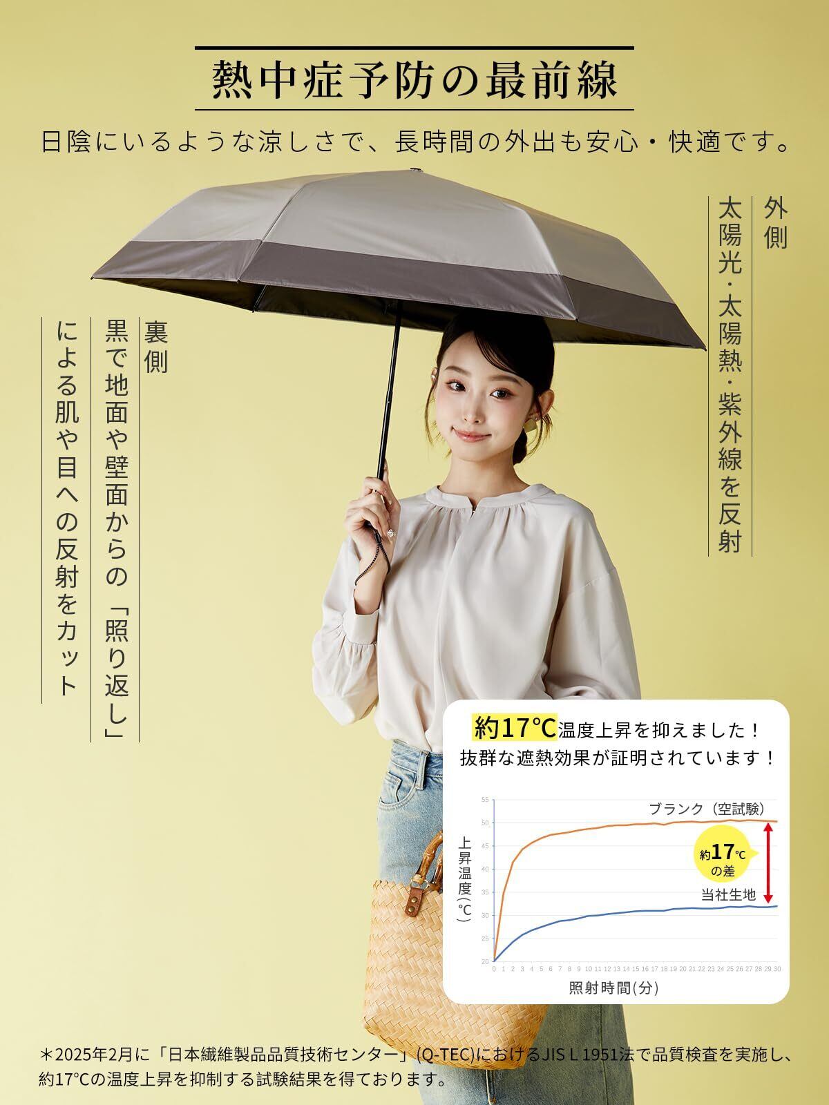 【完全遮光100%・約-17℃の遮熱効果】真夏の強い日差しも気にせずお出かけできるように、遮光率100%(一級遮光)、UVカット率100%、近赤外線遮蔽率99.9%、UPF50+の高機能生地を採用しました。生地の裏側にはブラック遮熱コーティングを施し、太陽光線をブロックするだけでなく、地面や壁面からの照り返しによるUV反射もカットし、お肌と目をダブルで保護します。暑さを感じる可視光線と赤外線をしっかりカットすることで、木陰にいるような涼しさで出かけも楽しくなります!QTECの実証データによると、約17℃の温度上昇を抑えることが確認されています。真夏の日差しから守り、美肌を守る日焼け対策に最適な高機能日傘です。(「日本繊維製品品質技術センター」 (Q-TEC) におけるJIS L 1055 A法で品質検査を実施し生地の遮光率100%とUVカット率100%の生地品質検查報告書を取得しております。)