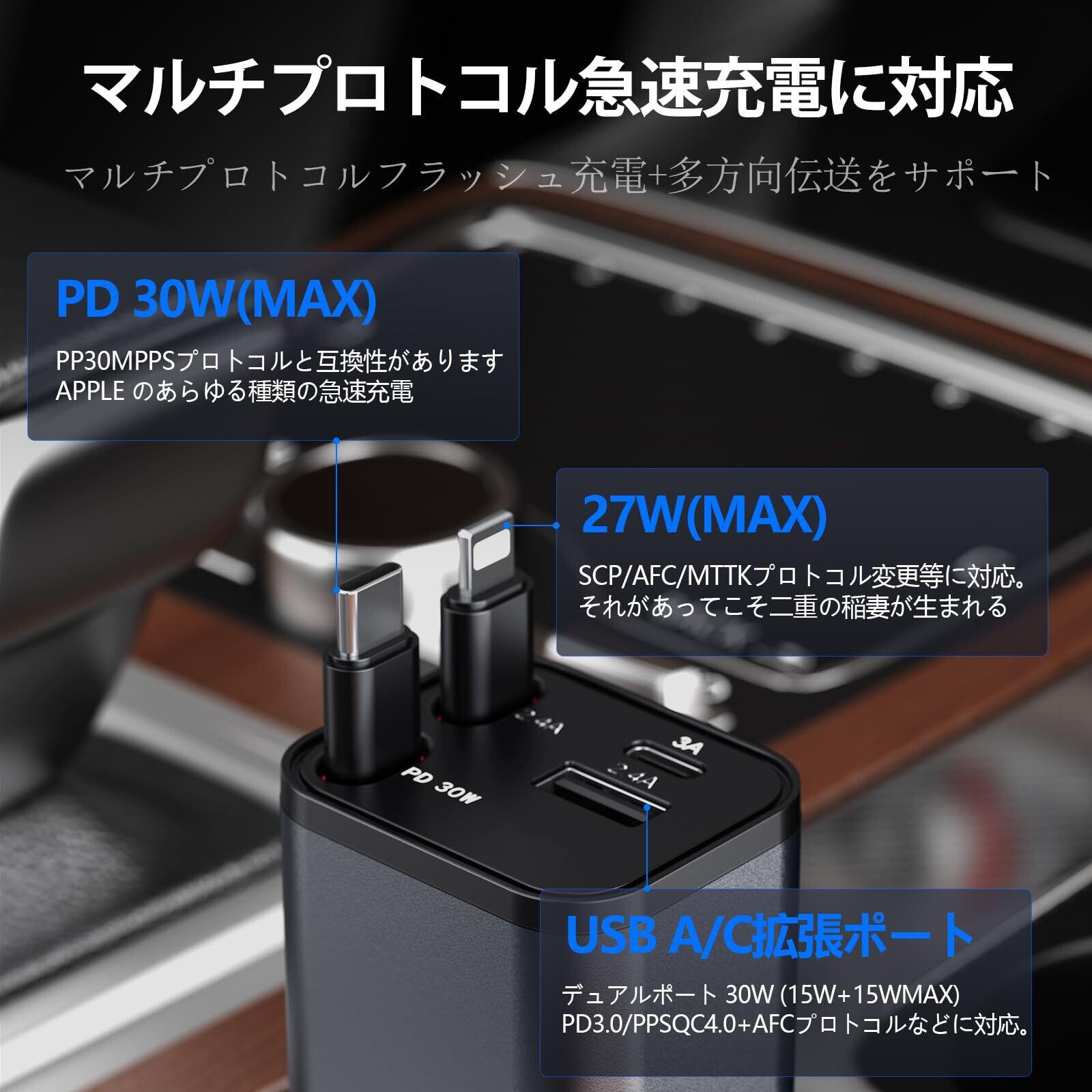 【数量限定】【ミニ 巻き取り式】4in1 車 充電器 シガーソケット 4台同時充電 カーチャージャー 巻き取り式充電ケーブル 2本 87W急速充電 車載充電器 対応iPhone 16/15/14/13/12, Galaxy S22/S21 UItra, Xperia, iPad