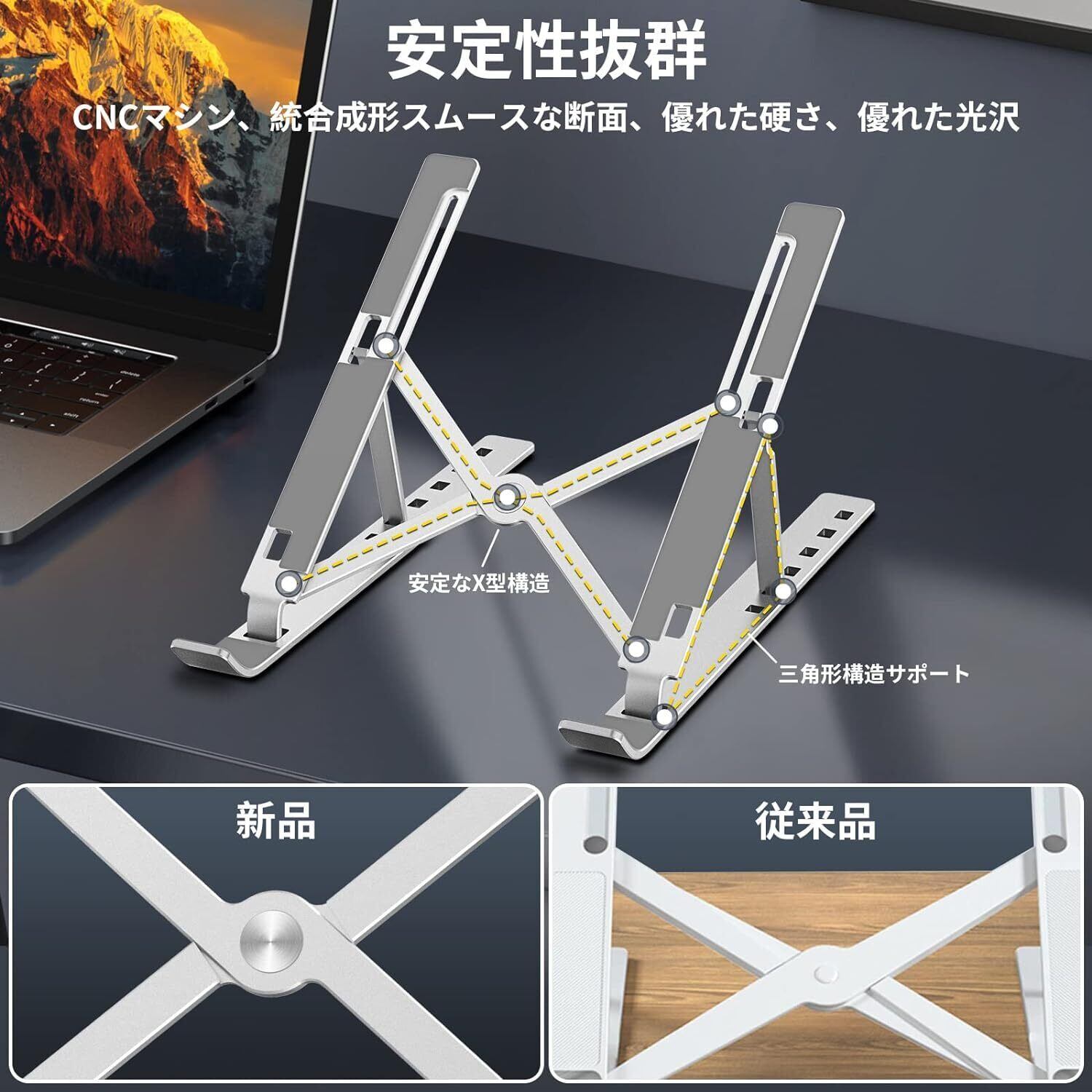 【安定性抜群・安全安心】パソコン スタンドは高品質のアルミニウム合金を採用し、統合成形スムースな断面、優れた硬さ、優れた光沢です。X型構造と三角形構造のデザインは、頑丈で安定性抜群、重いノートパソコンを乗せても傾きがなく安定しています。また、ご購入日から1年以内の初期不良および正常な使用範囲内で発生した故障、破損、その他の不具合があった場合は、各種対応をさせて頂きますのでご安心して連絡ください。