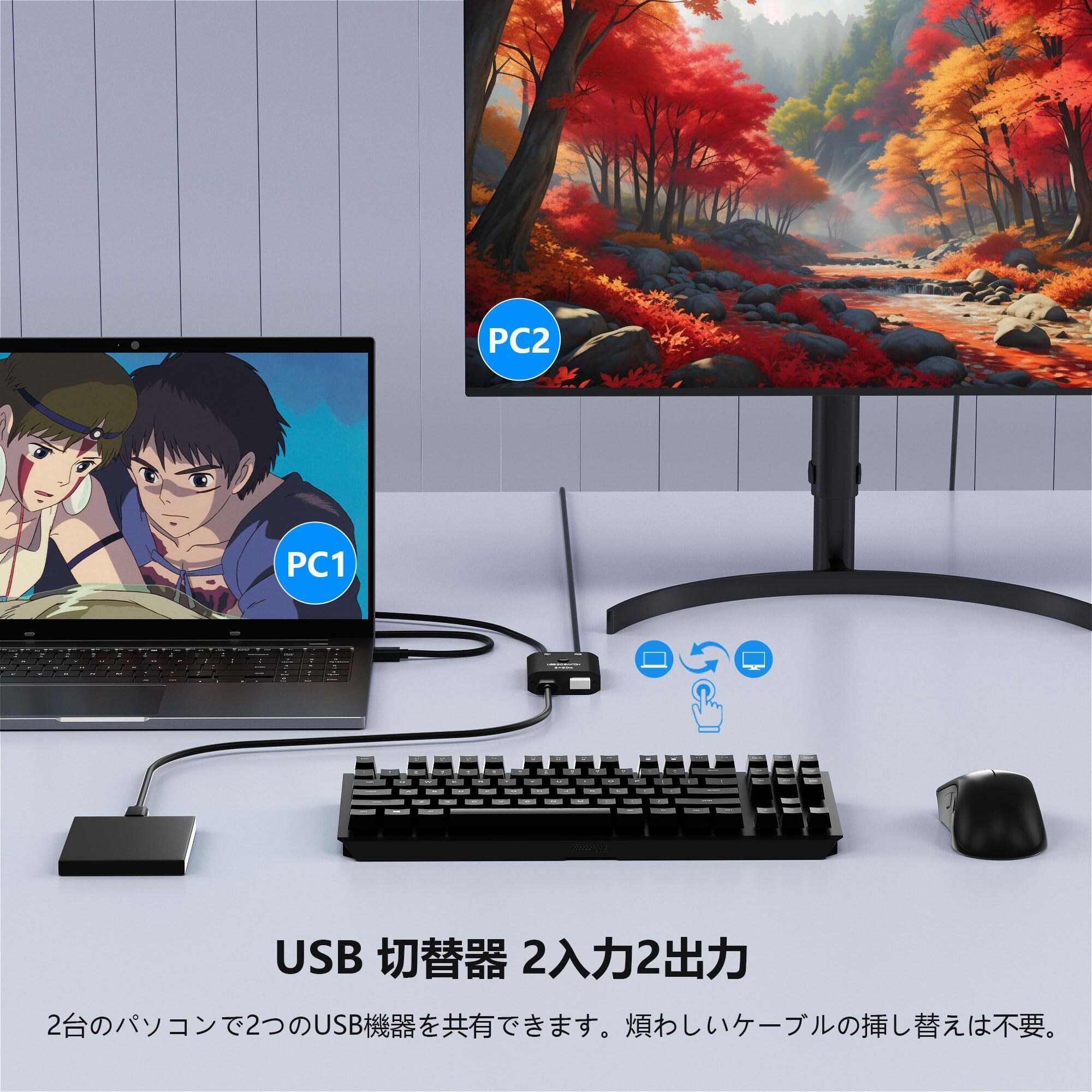 【幅広い互換性】USB切り替え器は幅広い互換性があり、さまざまなディスプレイデバイスを自動的に識別および照合できます。デスクトップPCでもノートPCでも Windows OS、Linux OS、Mac OSが混在した環境でも使用可能です。また、PC、ラップトップ、プリンター、スキャナー、マウス、キーボード、さまざまな種類の入力デバイスまたは信号ソーススイッチをサポートします。【パッケージ内容】1 x USB 切替器、2 x USB3.0ケーブル、1 x 日本語取扱説明書。