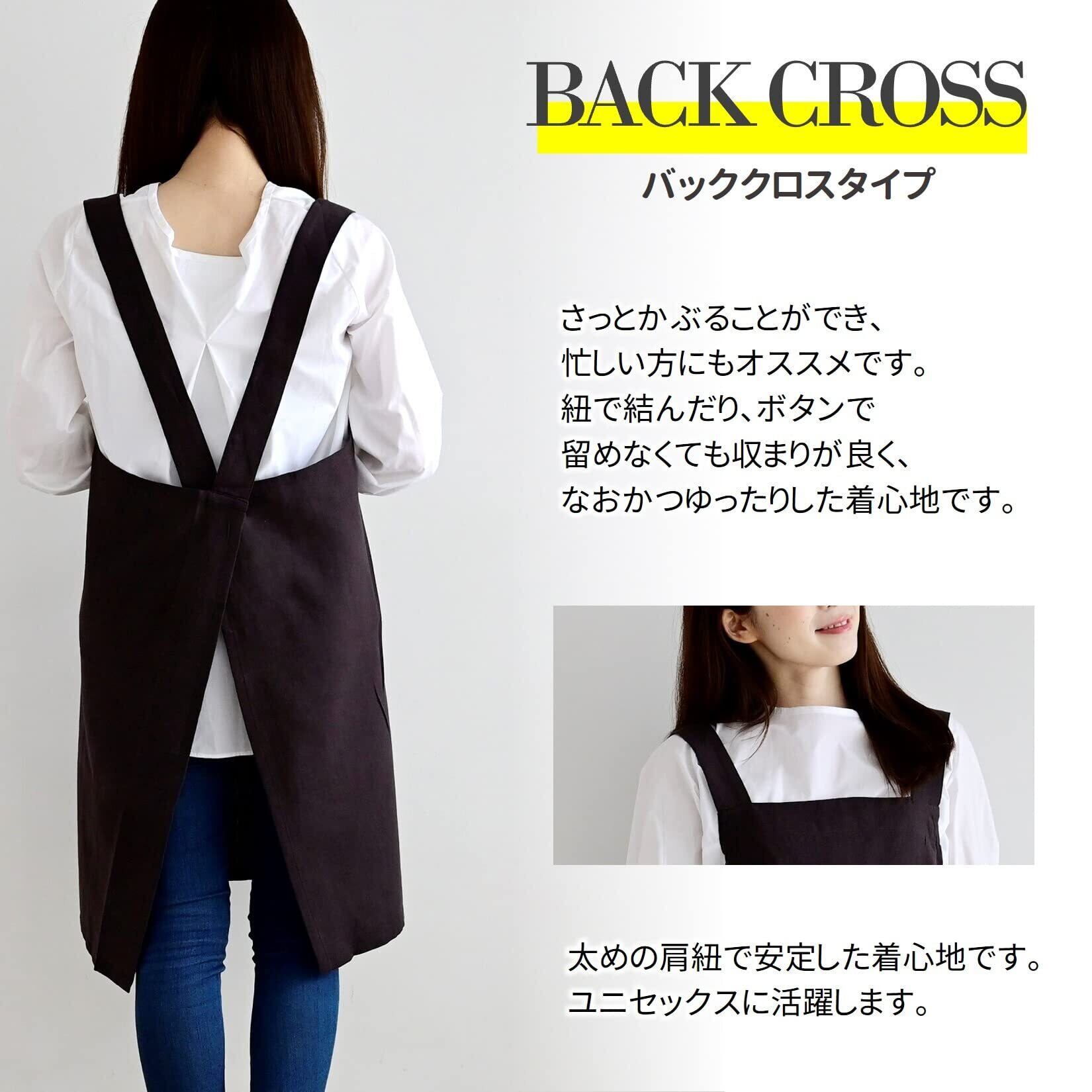 着用が楽ちんなかぶるだけのバッククロスタイプのエプロンです。シンプルなカラーの無地デザインなので、お洋服を選ばずに、ユニセックスアイテムとしてもおすすめです。