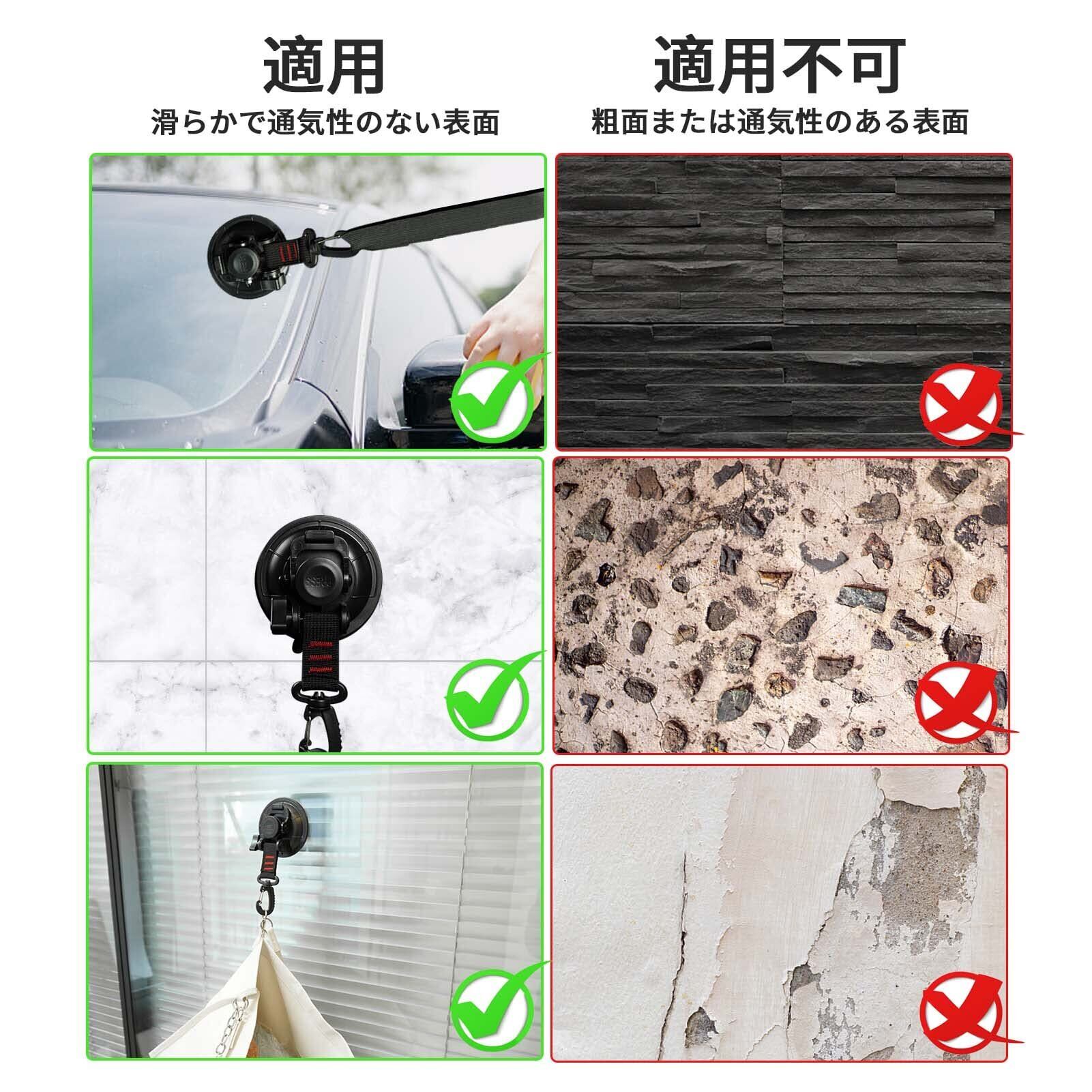 【多用途】吸着フックは殆どの物を固定することができる優れた方法です。いつ落ちるかの不安に悩まされることはもうありません。カーサイドタープやサンシェードの固定として使用できるだけでなく、屋内外での使用やカーキャンプや旅行などでの仮設アイテムフックとして使用できます。アウトドアに最適ですが、家でもバスルームやキッチンのフックとしても使用することができます。