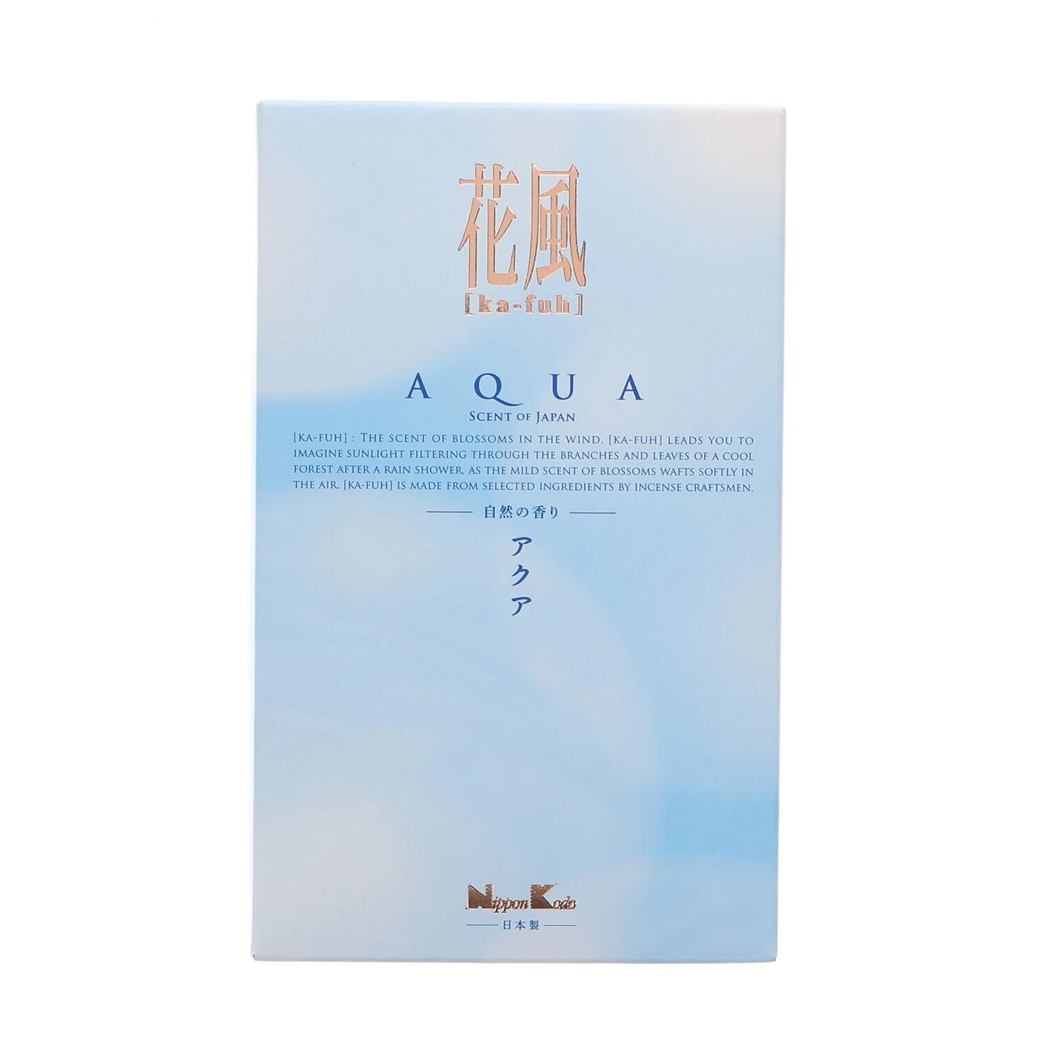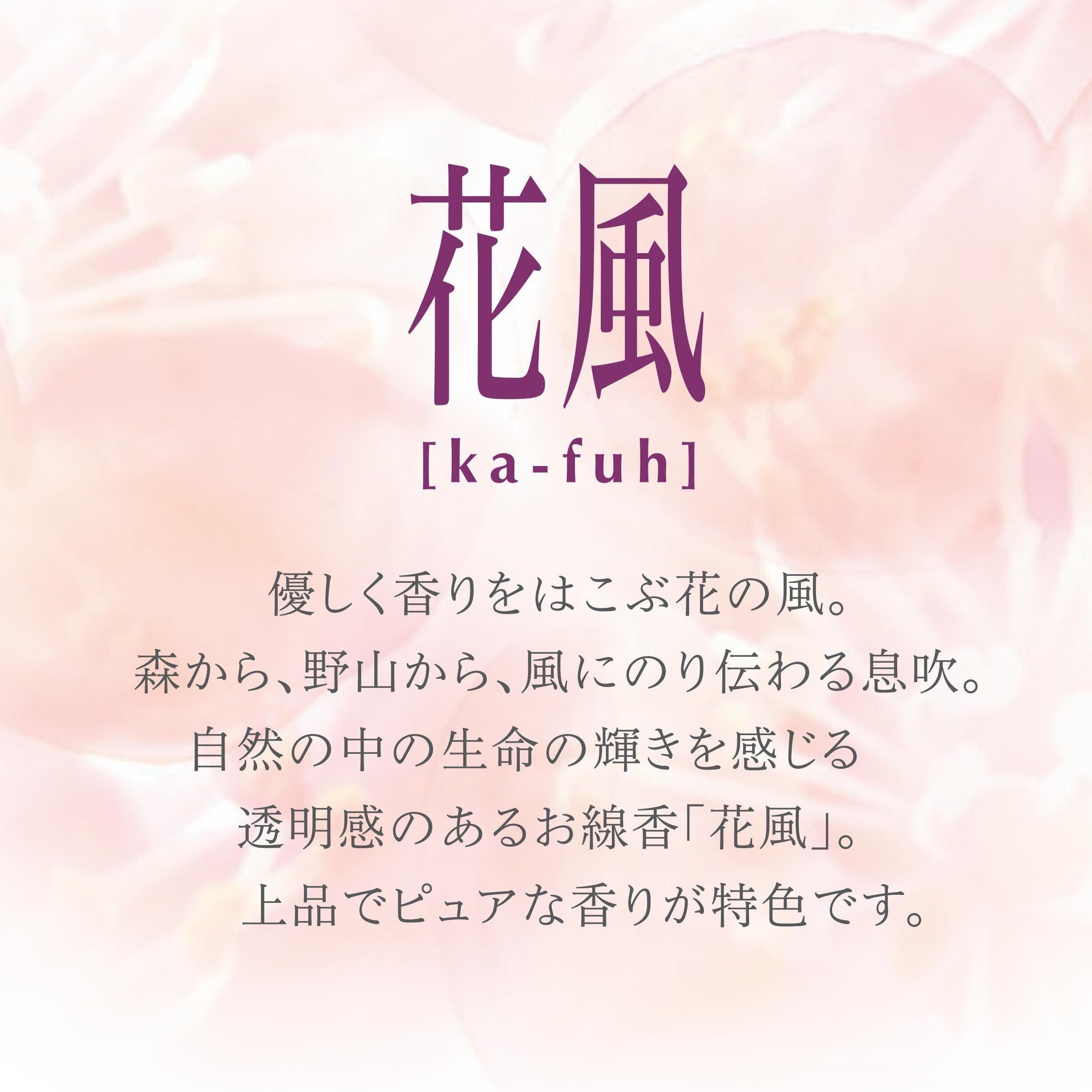 花風は、優しく香りをはこぶ花の風。●空気、水面、木漏れ日ー●景色にとけこんだピュアな香りの息吹は、やがて花風となり、ひろがってゆきます。●輝くような自然の香りにこだわったけむりの少ないお線香です。●アクア●青々とした新緑の間からきらきらとこぼれ落ちそうなほどの木漏れ日を浴びて、みずみずしく湧きいずる清流をイメージしました。透明感のあるグリーンとアクアノートに、ローズ・ジャスミン・シクラメンなどの花々の香りが清涼感を思わせる上品な香りに仕上げました。 ●かすかなけむりで、さわやかな香りがしばし心に残ります。