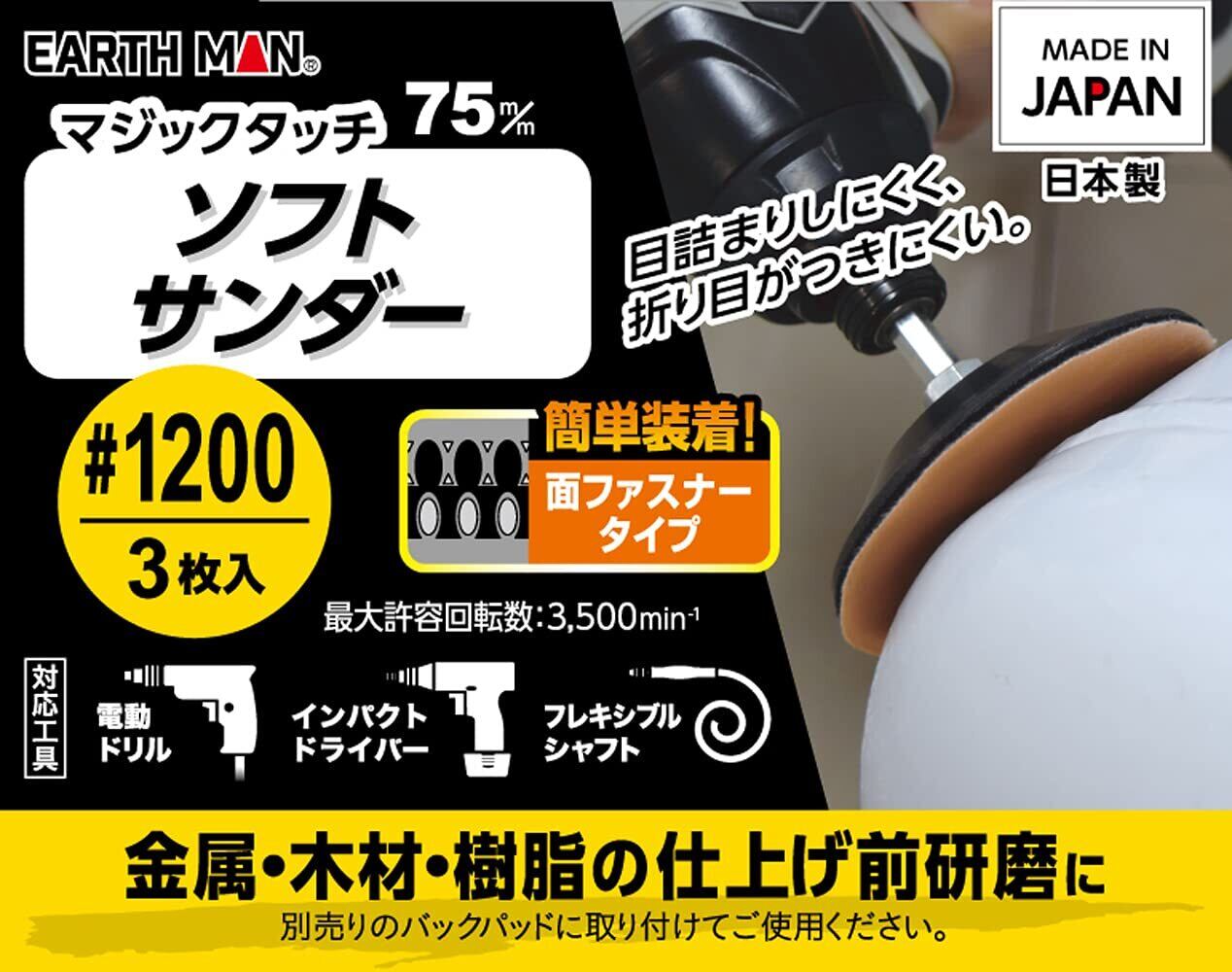 【2022最新】高儀 マジックタッチ 75mm ソフトサンダー 3枚入 #1200 EARTH MAN 電動ドリル インパクトドライバー フレキシブルシャフト 仕上げ前研磨 面ファスナー 日本製 たかぎ