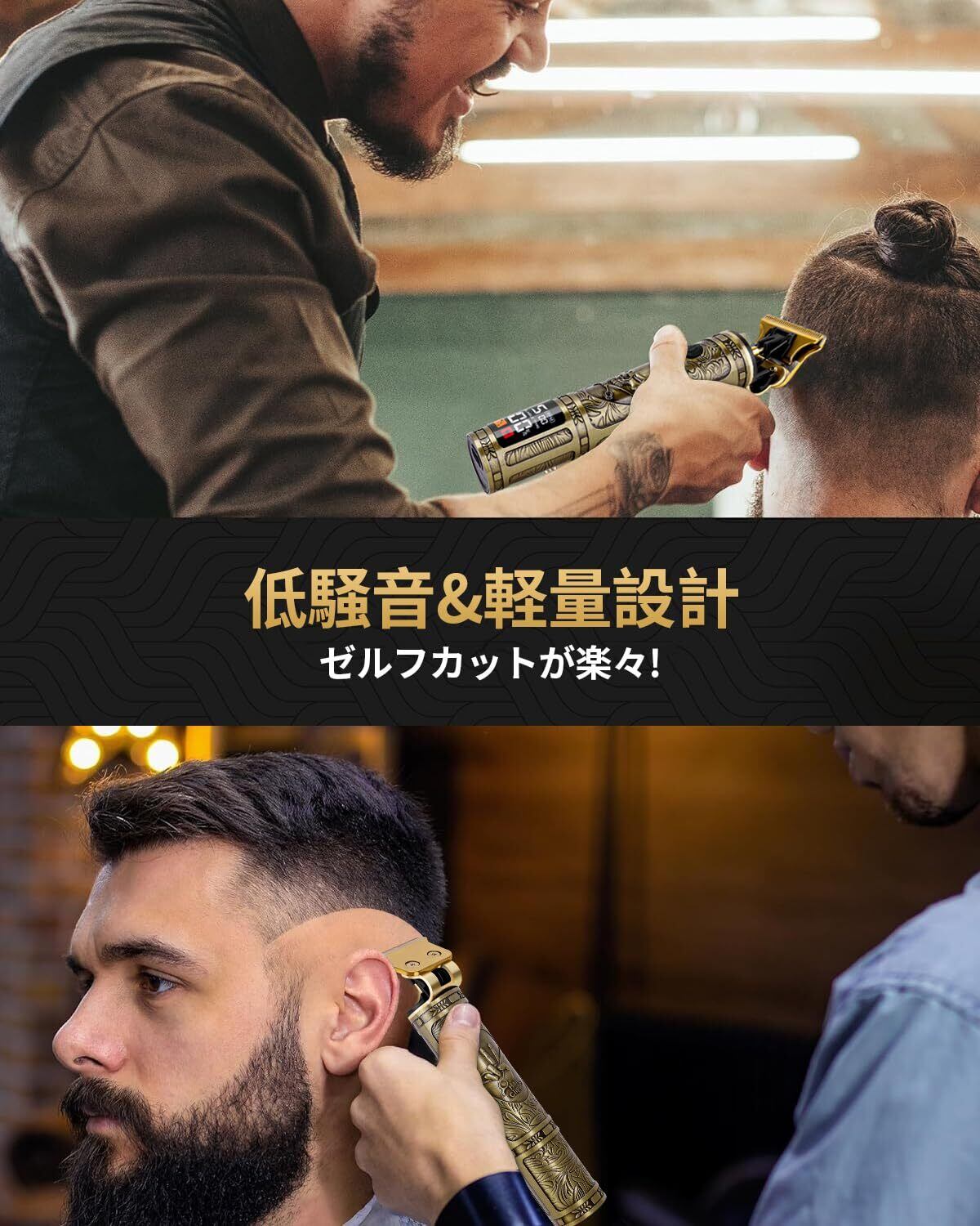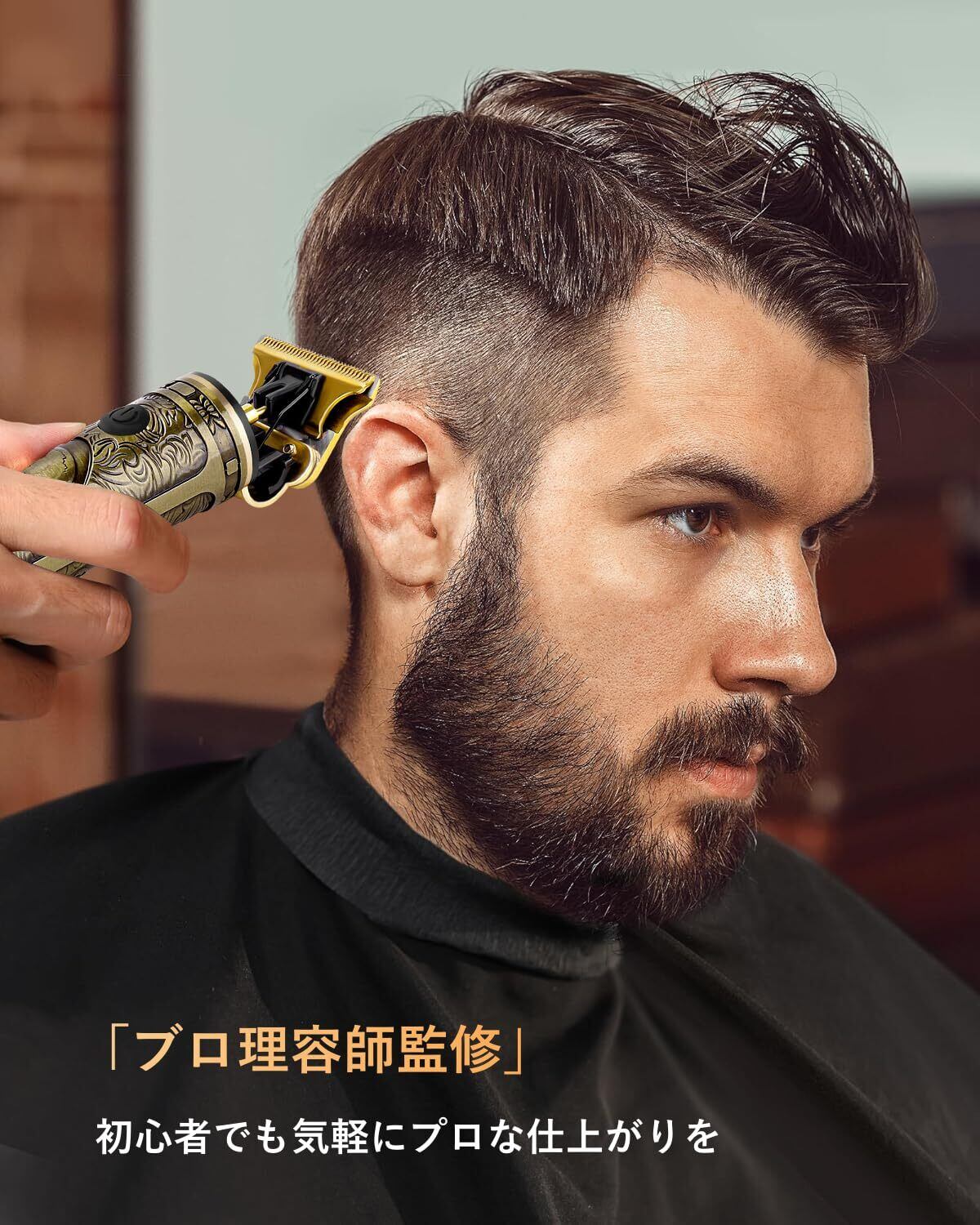 【レリーフパターンデザイン&切れ味抜群&安全性】バリカンはスタイリッシュな外観と高品質のブレードを備えています。ヘアカッター全体が精巧に彫られ、細部に至るまで細心の注意を払ってパターンが作られ、デザインがかっこいいです。カッターヘッドはR型取り刃設計を採用しており、優れた切断性能、髪の毛を絡まない優れた切れ味と滑らかさ、安全で迅速なトリミング、そして肌を傷つけません。簡単・安全な設計で初心者でもご心配なく使えます。簡単に好みの髪の長さ、もみあげにカットできます。
