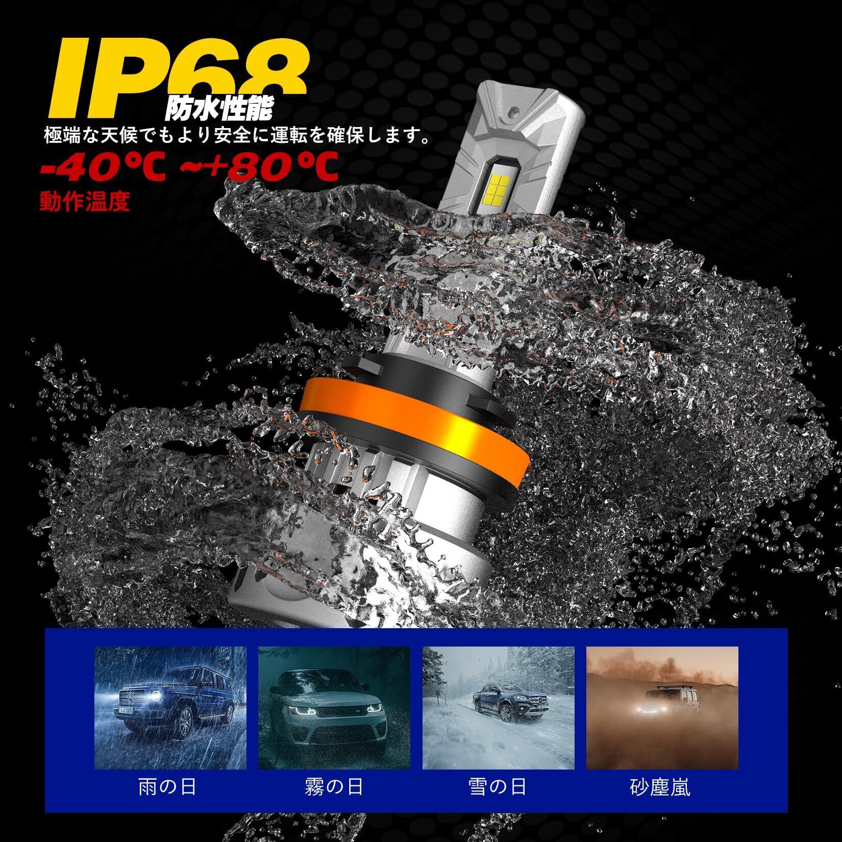 【防水性能&キャンセラー内蔵】当社のh11 ヘッドライト ledはIP68レベルな防水性能を備えています。特殊な材料や密閉構造により、外部からの水や湿気の浸入を防ぎます。これにより、雨天や雪道などの悪天候下でも安心して使用することができます。キャンセラーが内蔵されているため、ラジオへの影響を防ぐことができ、球切れ警告も解消できます。99%の車種対応できます。【※ご注意※】 外車または一部の国産車でご使用する場合、インジケーターの不点灯や点滅や警告灯など誤作動を起こす場合がございます。また解決できないと、ご遠慮なくこちらに連絡してください。