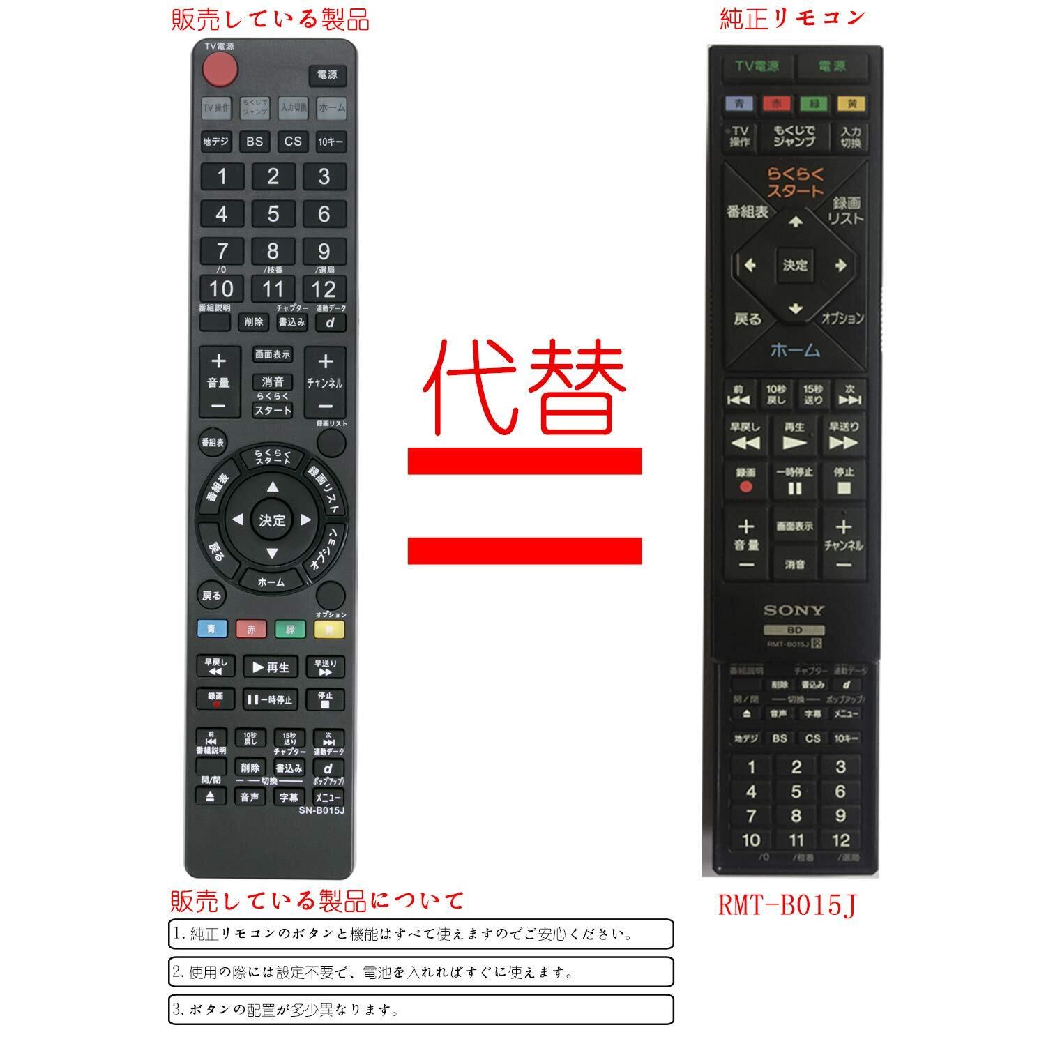 この製品のボタンの配置が純正リモコンと多少異なりますが、分かりやす く使用可能です。しかも、純正リモコンのボタンと機能は全て使えますのでご安心ください。※出品のリモコンは代用リモコンでございますので、ご了承の上、ご購入くださいますようお願いします。※実物は掲載された画像をご参考ください。ご注意:①このリモコンは「RMT-B015J」の代用リモコンとして使用できます。 このリモコンは汎用リモコンではなく、他の型番の代用リモコンとして使用できないでございます。ご了承の上、ご購入ください。②このリモコンで操作する前に、アルカリ乾電池(新品)をご利用ください。