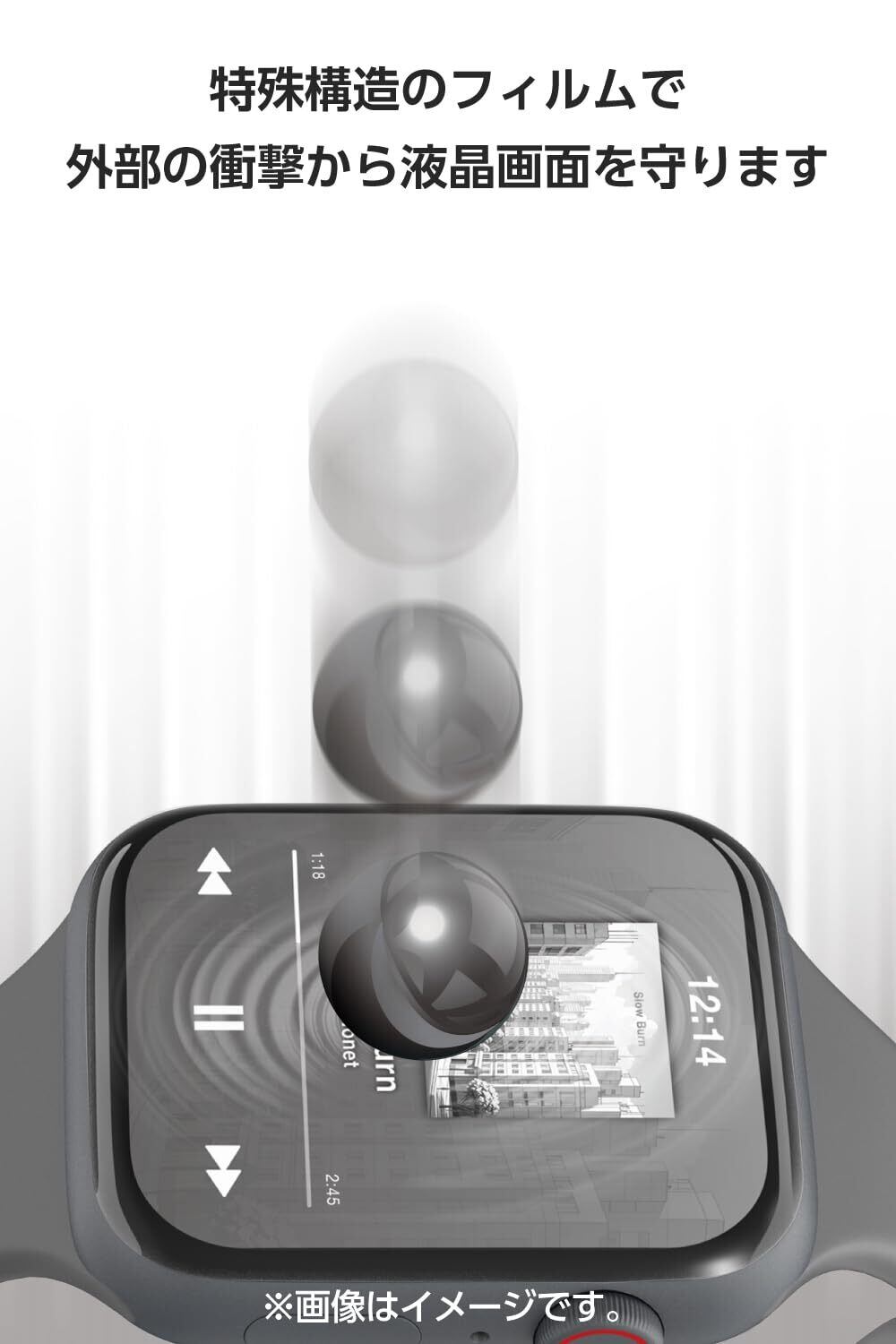 ■画面の曲面に沿った3D設計で、端末のデザインを損なわずに衝撃から守る衝撃吸収・高透明タイプのApple Watch用フルカバーフィルムです。