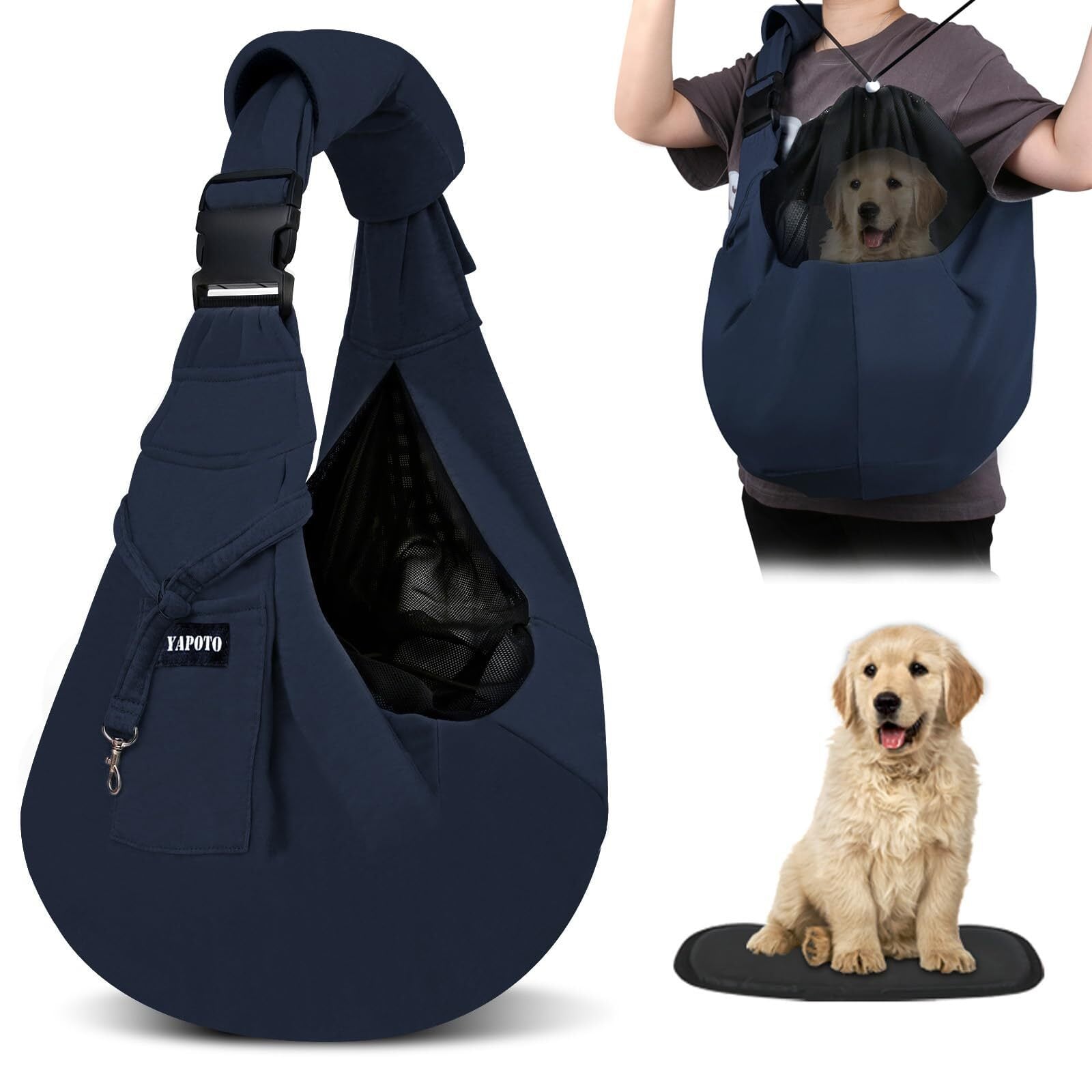 【現役ペットトレーナー監修】YAPOTO ペットスリング 犬 抱っこ紐 2026最新型 スリング 犬 猫 小型犬 ペット バッグ キャリー リュック 肩掛け 調節可能 飛び出し防止 メッシュネット 肩パッド 両面仕様 底板付き (ネービー)
