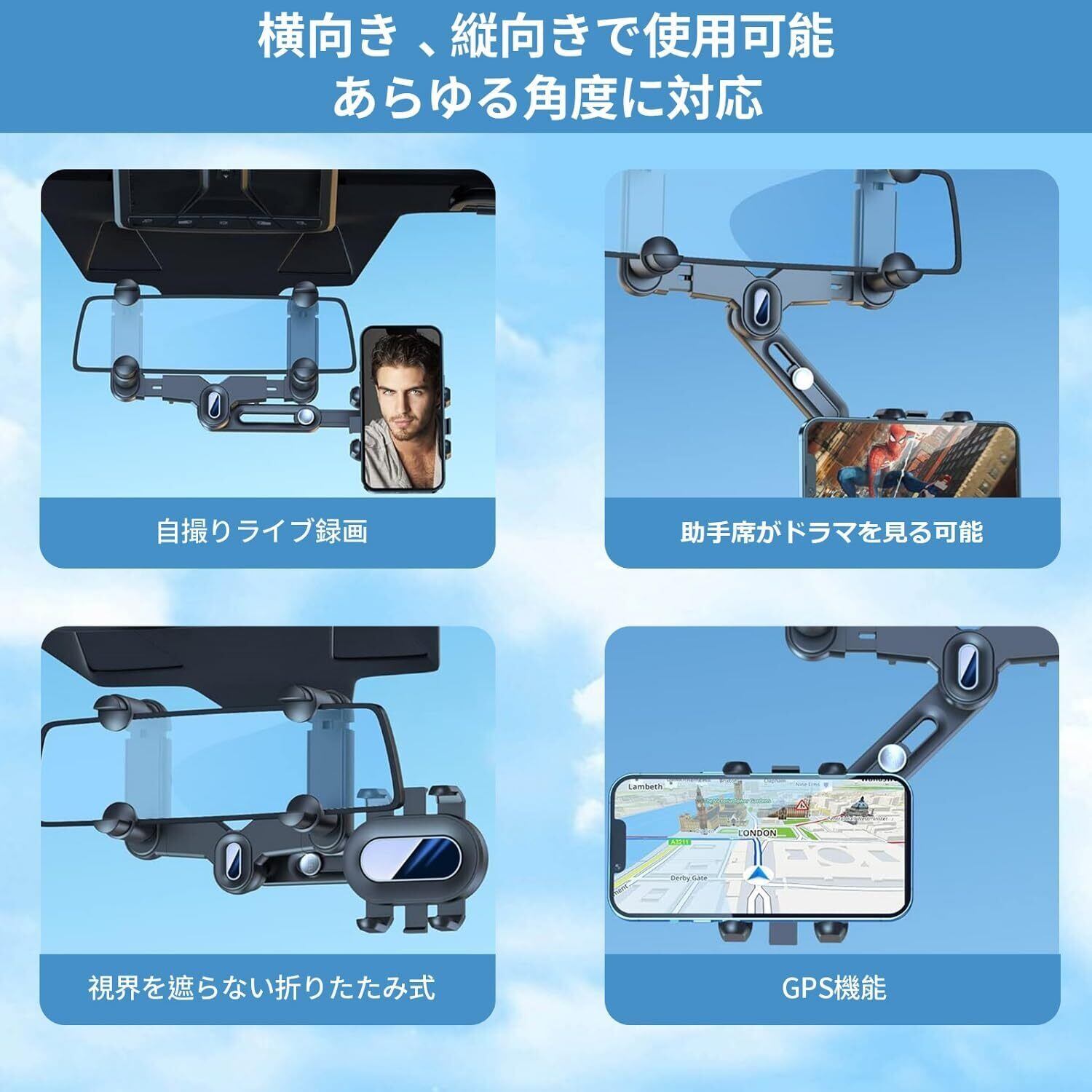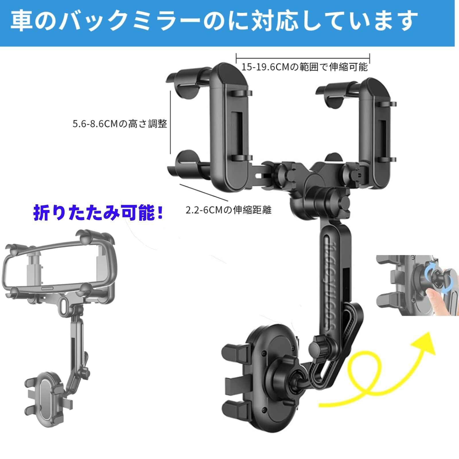 【2024年新版】 車載ホルダー バックミラー スマホホルダー 車 クリップ式 車用携帯電話マウント ルームミラー 取り付け型 スマホスタンド 360度回転 角度自由調整 伸縮式 多機能携帯電話ホルダー 取り付け簡単 縦横自在 安定性 運転視界阻害しない 全機種スマホ対応 日本語説明書付き
